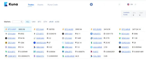 Kuna offers a diverse range of cryptocurrencies for trading, encompassing well-known options such as Bitcoin (BTC), Ethereum (ETH), Tether (USDT), Ripple (XRP), Litecoin (LTC), Bitcoin Cash (BCH), Cardano (ADA), Stellar (XLM), EOS (EOS), and Tron (TRX). This selection provides users with a broad spectrum of choices when engaging in trading activities on the platform.
