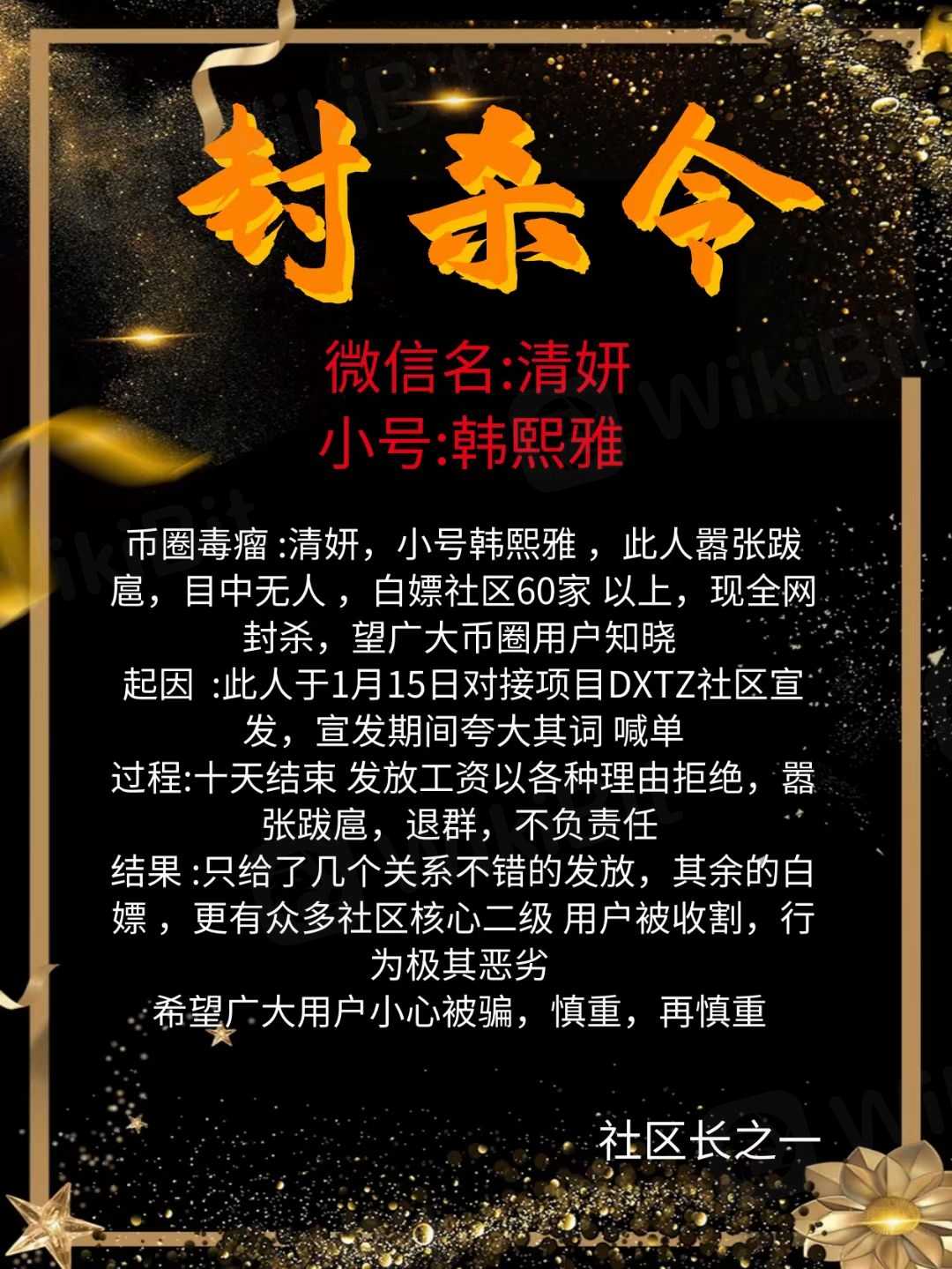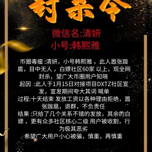 币圈毒瘤 :清妍,小号韩熙雅 ,此人嚣张跋扈,目中无人 ,白嫖社区60家 以上,现全网封杀,望广大币圈用户知晓