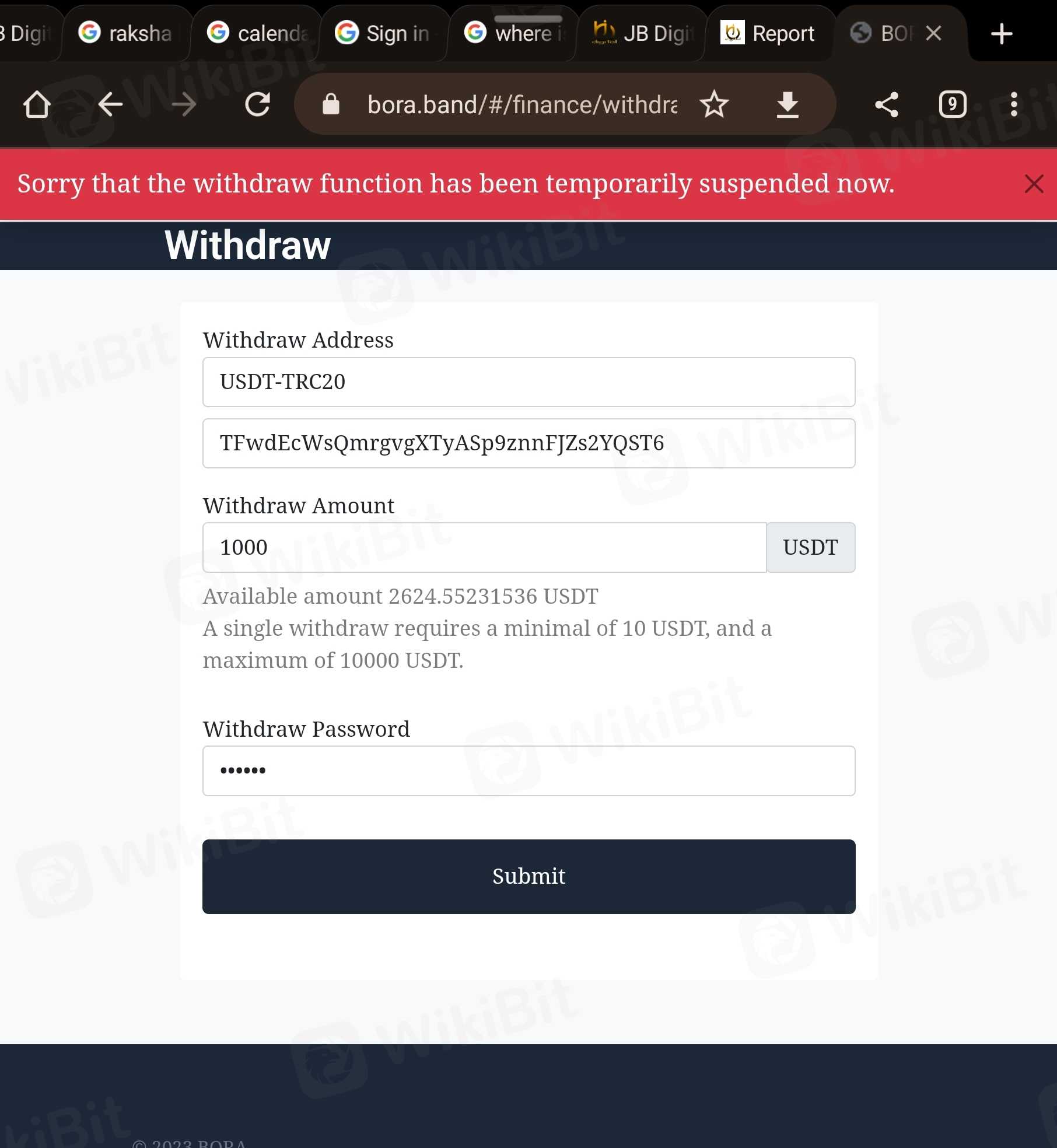 The BORA NSQ exchange has been subjected to tax evasion and money laundering by some users who use false identity information to register for false transactions, and there are tax evasion and money laundering behaviors, resulting in the flow of money laundering and black funds into the exchange! At present, BORA NSQ exchange is actively preparing for listing. According to the international securities law and international anti-money laundering law, federal investigators are sending an investigation notice to our company. Now BORA NSQ exchange will temporarily close the withdrawal business and wait for the problem to be thoroughly investigated and dealt with. After that, it will be fully released.