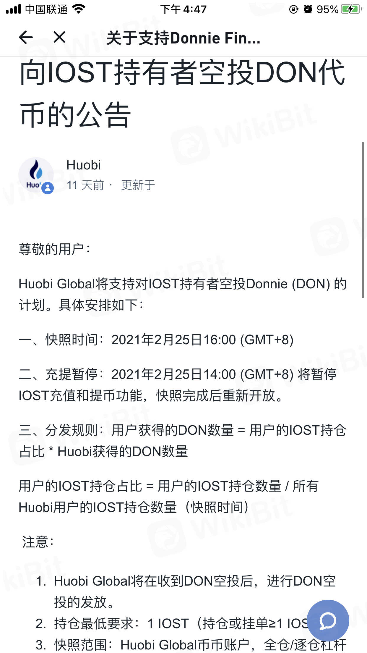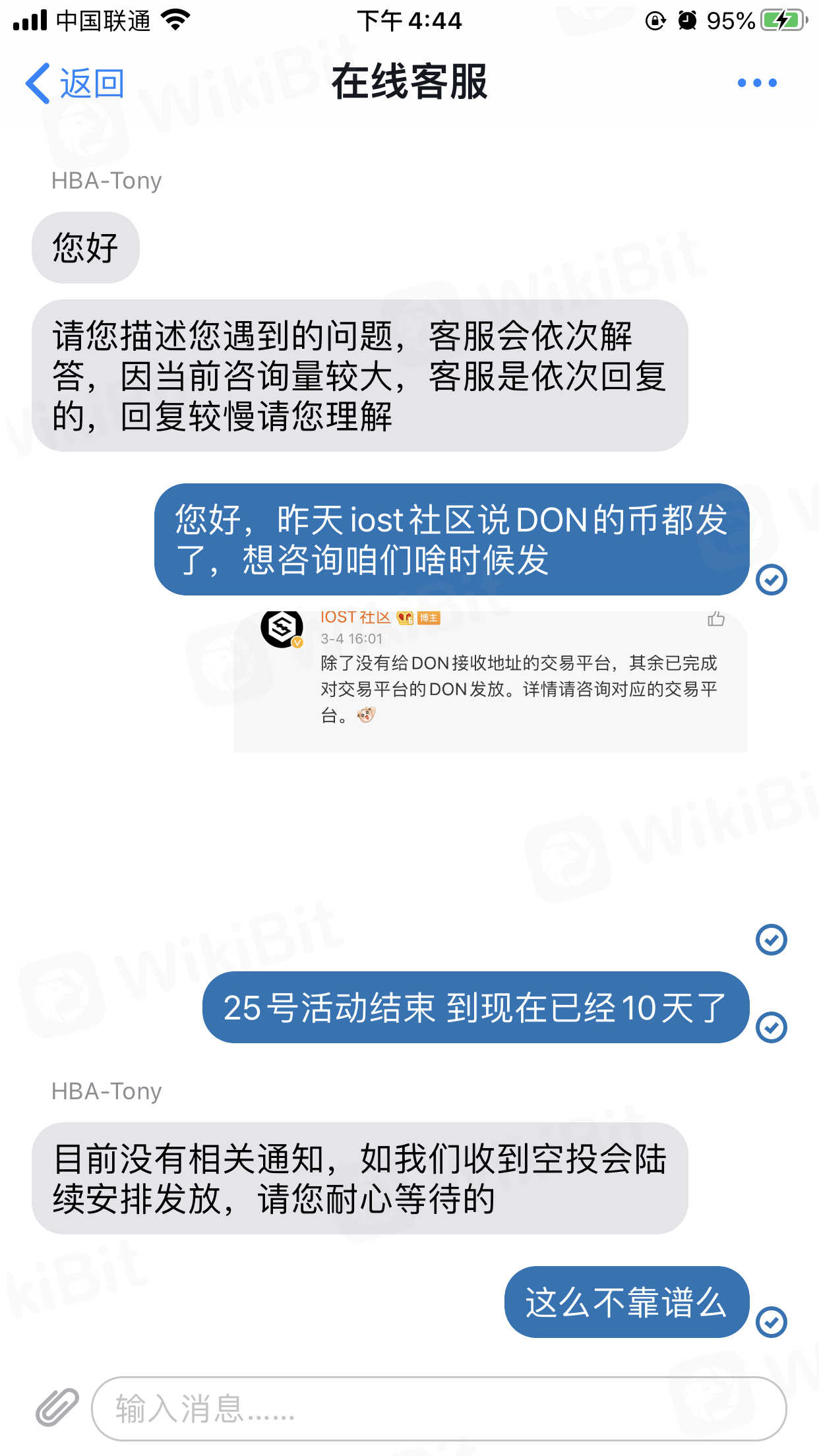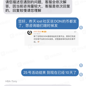 iost社区3.4日已经对提交地址的交易所发放了DON币,唯独火币迟迟没动静。虽说没几个币,但是官方信誉是一点都没了