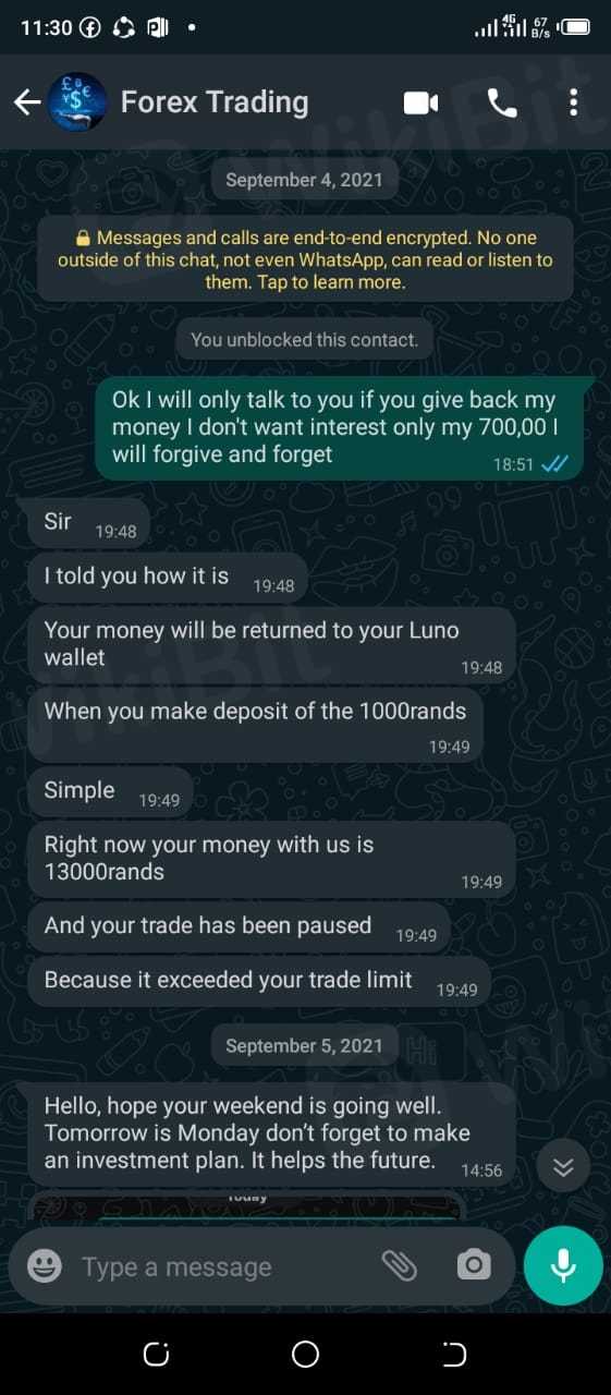 Inversión en operaciones de cambio, todavía tengo al tipo en mi watsaped Lo conocí en Facebook, me dijo que me ayudará a duplicar mis inversores en 3 días, invertí R700.00 con él prometiendo que sería de R7000.00 invirtiendo en La minería de Bitcoin, solo para decirme que mi inversión ha superado los r7000.00 ahora es de r13000,00 y sé que debo invertir r1000.00 para poder acceder a mis ganancias, ¿cómo es posible?