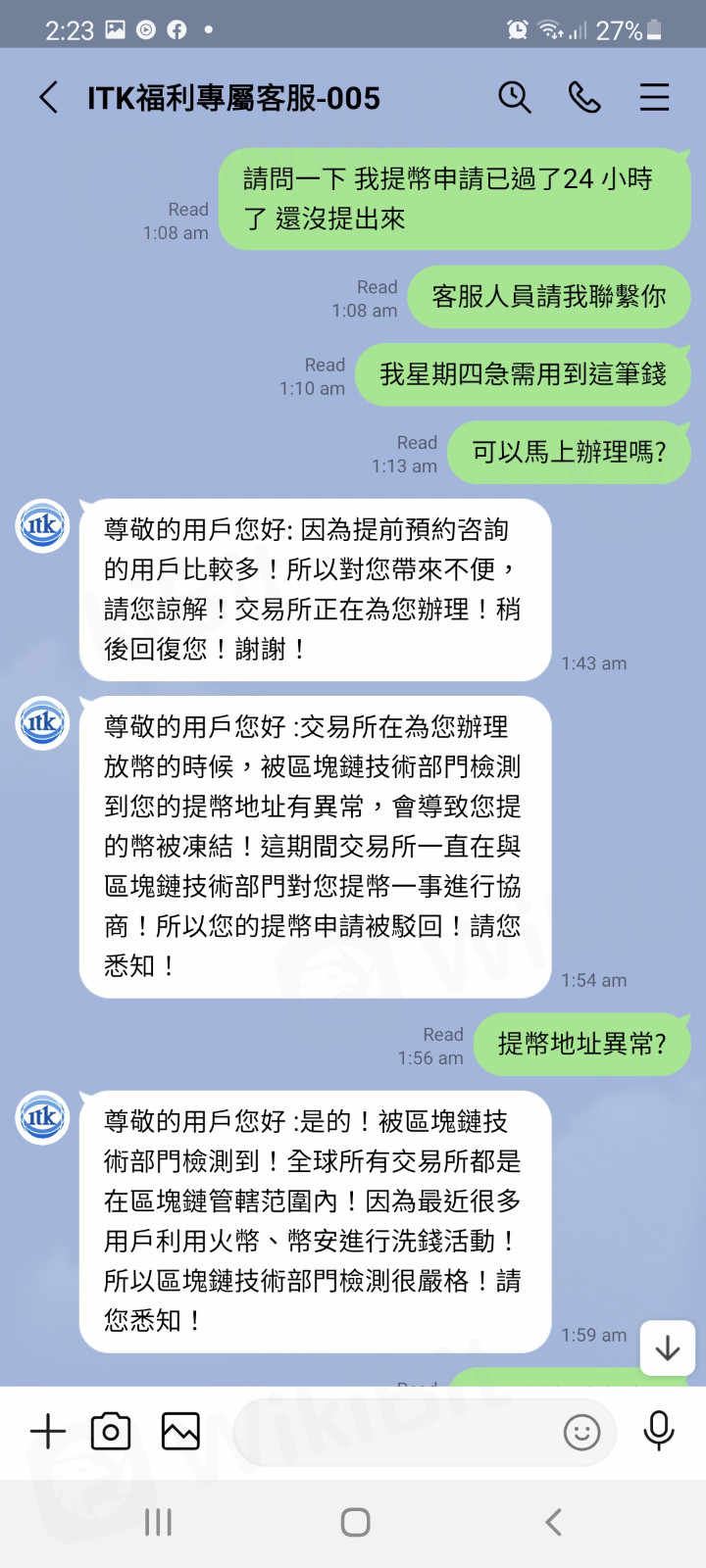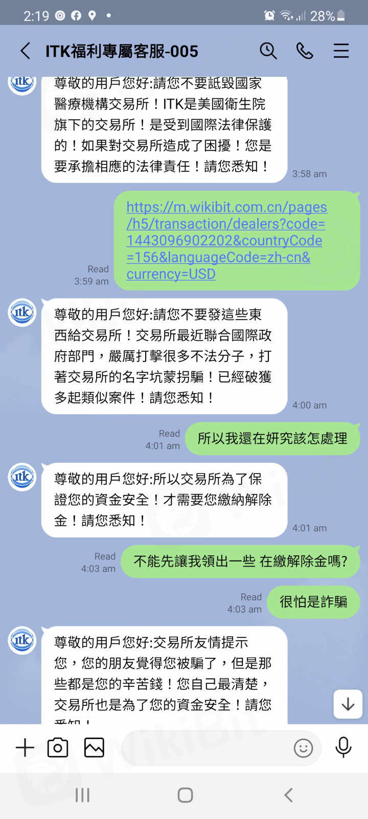 這個集團會派同夥在網路上找獵物,套路就是利用社群通訊軟體如(LINE或者微信)尋找特別是在海外的華人,會跟獵物聊一些有的沒的東西慢慢試探博取信任,之後會跟你吹噓他們是靠那個 ITK-EX 賺了好幾桶金。介紹你進來的人跟這個詐騙集團牠們都是一夥的別懷疑。新會員本金不多時,還會來給你出金,等到本金越來越大時,牠們會找藉口要你補金不然會凍結你帳號