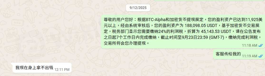 這是一個詐騙的網站,網址是https://www.btcalphawint.top/ ,之前被騙了1萬多美金,都拿不回來了,不要相信帶你賺錢的人,對方剛開始的誘導你投資小額,等到要你投資大額時,你就會無法提現,,,對方也會搞失蹤,,所以如果一樣跟遇到相同情況的交易者,請不要相信,因為這是騙子的手段!!!!