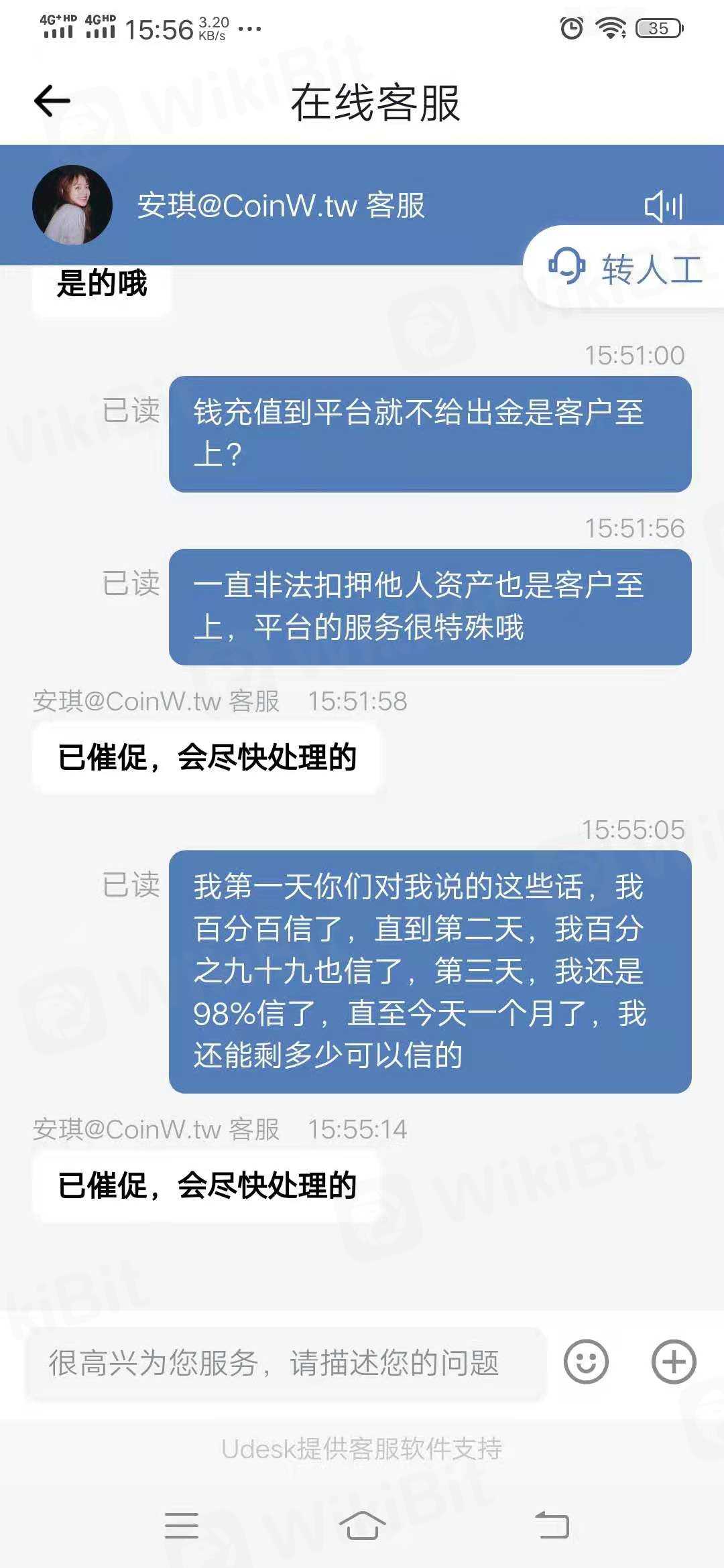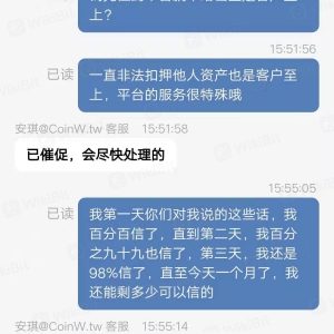被币赢无理由扣押资产一个多月了,提交完提出的各种证明资料,后面找客服一直耐心等待处理中这些骗小孩都不相信的话,有人说资产无法提现,先第一时间报警,再跟平台协商,要不然你的耐心等待实际是给平台充足时间销毁证据。