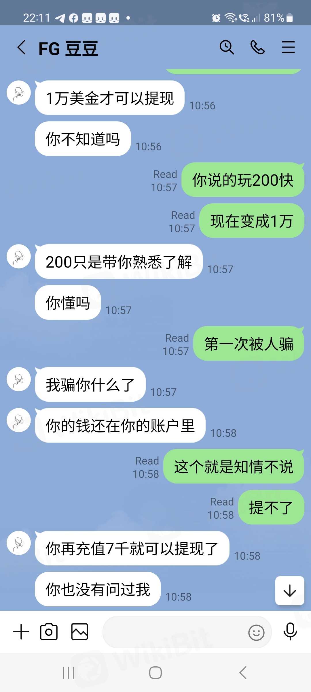 诱骗入金200u玩玩,然后好赚自己入金了3千。过后资金一定要加到1万u不然无法提币。去问了客服就说了一样的话,就是入金1万u才可以提币。然后客服发脾气就删除了我。
