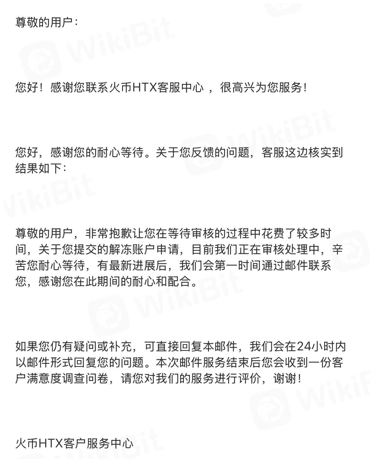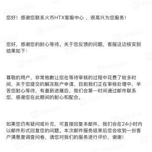 Mahigit apat na buwan nang nakakulong ang aking account. Wala silang ibinigay na dahilan para sa pagkakulong. Sa tuwing nagtatanong ako kung bakit kinulong ng Huobi ang aking account, wala silang maibigay na paliwanag. Kapag hinihiling kong kalasin ang aking account, lagi nilang sinasabi na maghintay lamang, ngunit walang anumang pag-unlad. Hanggang ngayon, mahigit apat na buwan na ang nakalipas, nakakulong pa rin ang aking account, at hindi ko pa rin ma-withdraw ang aking mga ari-arian.