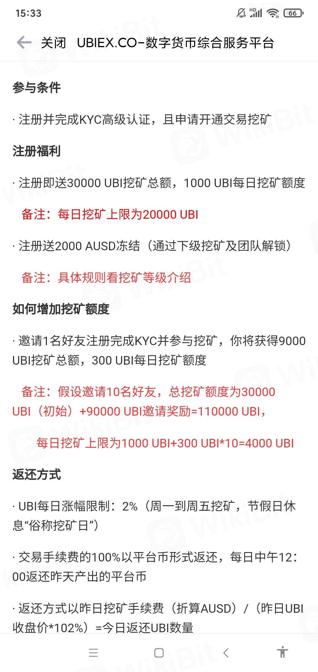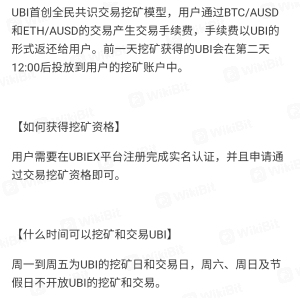 Ubiex起初是以交易挖矿的形式吸引了一大批人入场,通过usdt交易挖平台币ubi,起初的模式是ubi限制上涨5%,后来下降到2%,中间一直平稳上涨。后来出现砸盘,ubi价格下跌引起恐慌。模式不行了以后,给出了两种选择方式,一是平移到ubnk交易所,二是开放价格。开放是没有托盘,价格一路下跌,后期入场的都成了韭菜,而选择平移过去的还有一部分人没有到账。ubiex交易挖矿还需要充值会员,最低的都得500usdt,模式崩盘以后会员一点用都没有,交易挖矿关闭,提币也没有特权,也没有任何弥补。最近,otc通道里面只能买usdt,但是不能卖,没有服务商,其他币种的otc通道价格也极其低,基本上属于血本无归的状态。这个交易所的发展也基本上没人管,客服不管事,提币基本上没有反应,半个月都还在审核或者打回,不让提币到其他交易所。之前还有合约板块,但是后面出了状况,合约板块也关闭了,承诺的合约赠金也一直没有兑现。ubi现在全部属于冻结状态,交易不了,出金也无法实现。