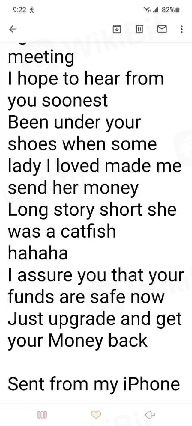 Saya telah scammed hampir 1.200.300 $ dolar dalam waktu singkat. orang itu mulai mengobrol dengan saya di WhatsApp dan facebook dia mulai mengiklankan platform platform investasi dia meyakinkan saya sejauh saya percaya dia adalah perdagangan yang baik. Setelah saya benar-benar nyaman, saya memutuskan untuk berinvestasi dengannya mulai dari $ 500 hingga $ 1,200,300, kemudian saya menyadari bahwa dia adalah scammer karena saya berhenti membalas saya. Diberitahu untuk tolong bantu saya dengan uang nanti dia memblokir saya. Jadi Jangan Percaya Siapapun untuk Berinvestasi