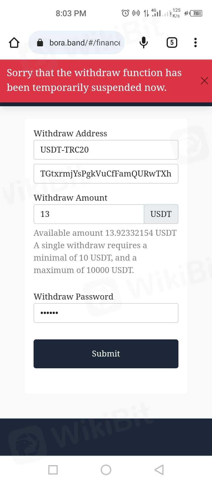 Bora.Band withdrawn is not working. They are saying to deposits 100USDT to active your account .If i deposit 100USDT than it will work .All fucntion are not working .