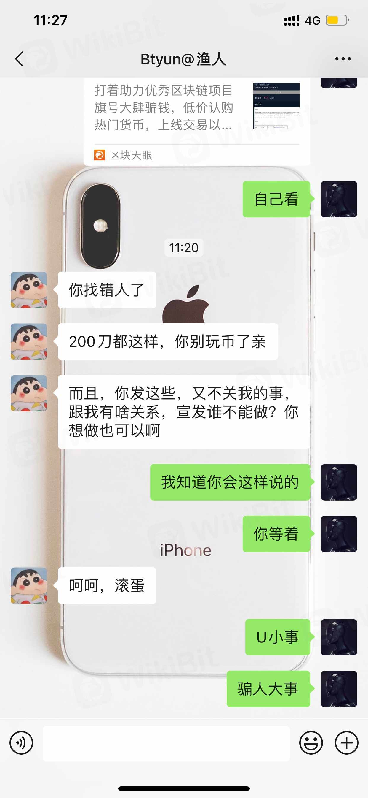 币云BTYUN打着认购新币开盘大涨的旗号大肆诈骗,低价认购热门货币(实则与热门币种无关),上线交易以后,价格和真实交易所不符,低价开盘,无法提币,害人害己。让投资者不能交易,提币也不成功,损失惨重。交易所标配币种,价格都也是正常和外面基本一致的,但是看看其他的山寨币价格,庞大的交易量及深度,你就会怀疑自己的眼睛是不是坏了。可以不靠谱到如此地步的山寨交易所,也算是刷新了眼界,大家千万别往里面充币! 大家小心上当受骗!!大家务必认清楚币云BTYUN交易所的虚假欺诈骗钱!