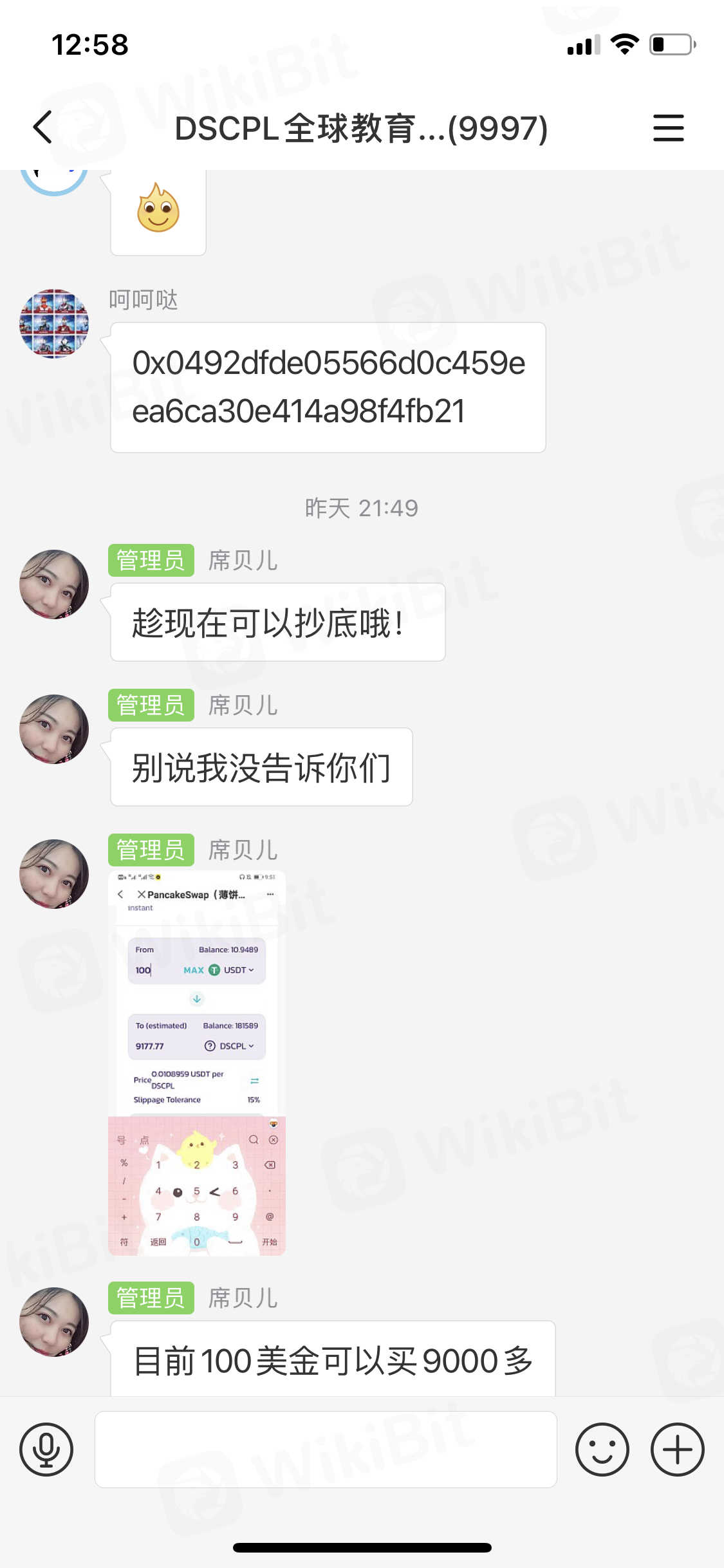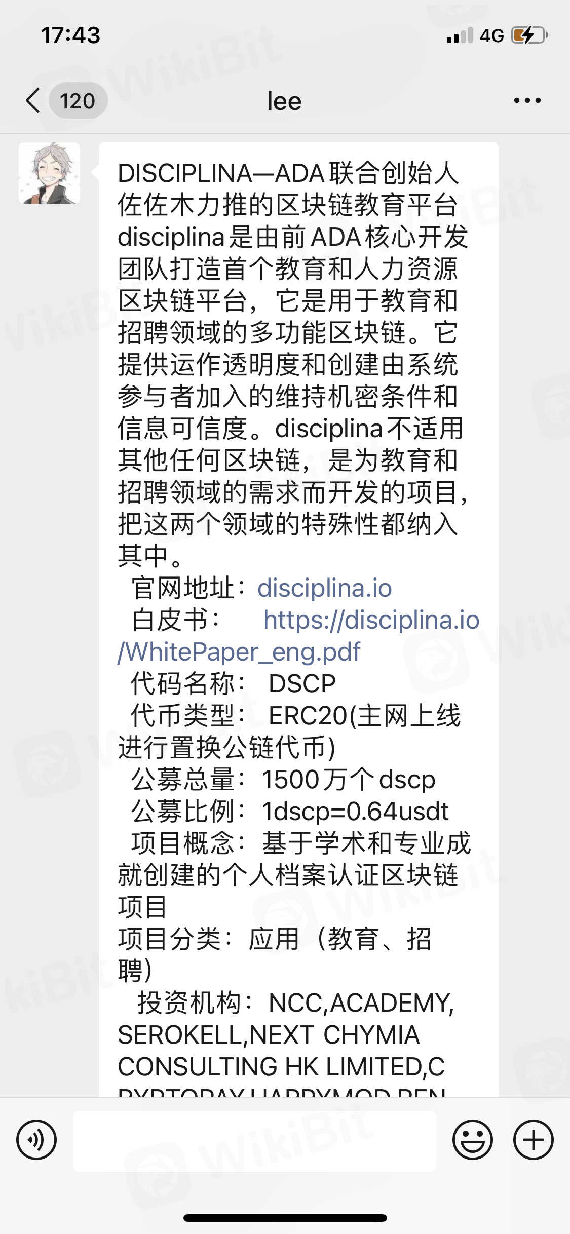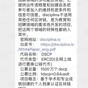 号称ada前团队 佐佐木投资的dscpl项目的诱导欺骗投资者!21年的1月份出现了一个项目他叫教育链dscp当时宣称全球公墓1500万枚dscp价格0.64u,三月份上线交易所。然而到了三月份该项目突然宣布启动换币计划1:10兑换由以太坊链上换到bsc链上 成dscpl后上交易所搁浅。又到了五月份突然开通了uniswap上交易。都知道uniswap上的币是以太坊链上所以换到bsc上的dscpl等于废币。后来开始官方就开始链上卖币行动。然而到了五月底突然出现了好多市场队长新建各种群聊拉新人教导如何买币。现在公墓投资者净亏6.5倍。目前代投人lee(微信号btcwin888888)开始耍无赖把公墓投资者删好友踢出群聊 .该代投人特意夸大宣传后收割韭菜实为可恶。望新人切勿盲目相信他人话语远离dscpl