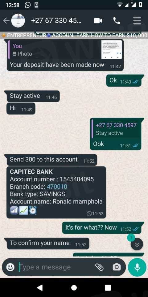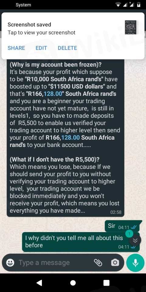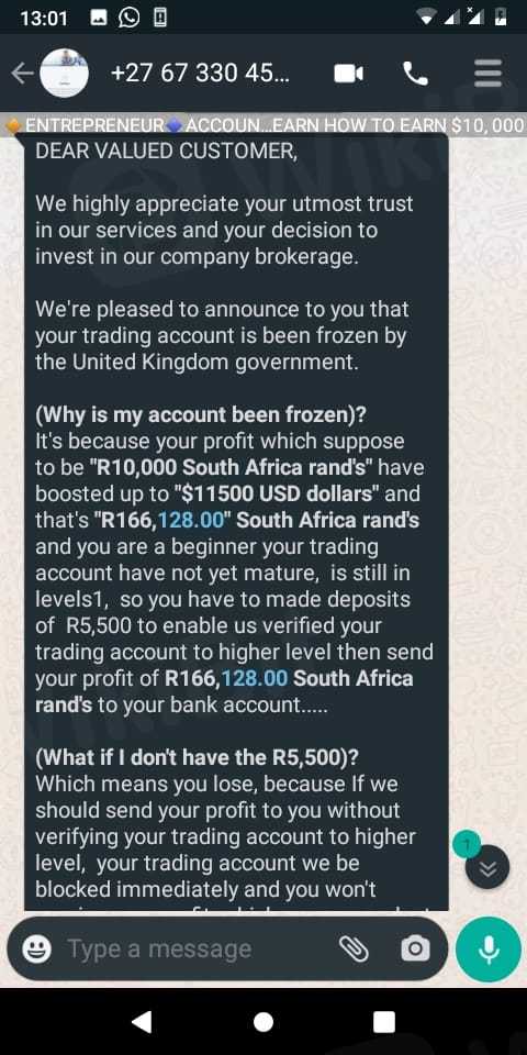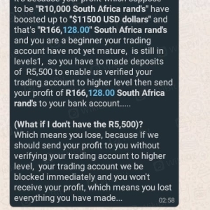 The next day morning I received a message saying that I need to pay R5500 in order to make the withdrawal