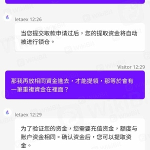 提币时被告知还要充值相同的金额才能提,也不知是否有人知道这家letanx交易所,并遇到与我相同状况?
