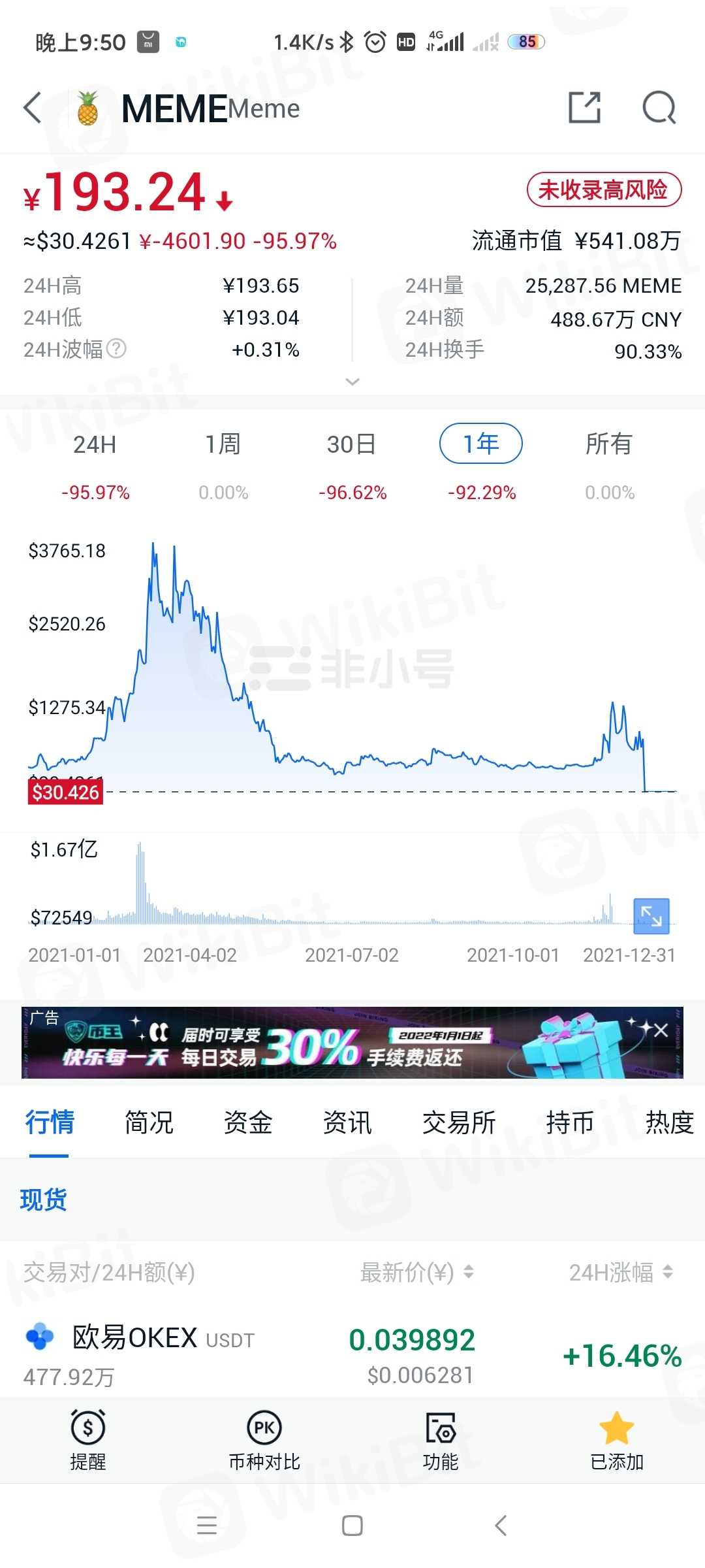 MEME菠萝币跌破90多点,欧易不公开以前的数据
