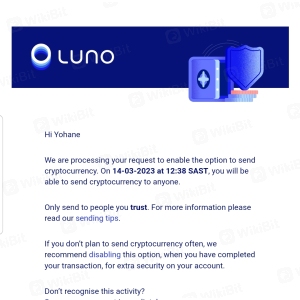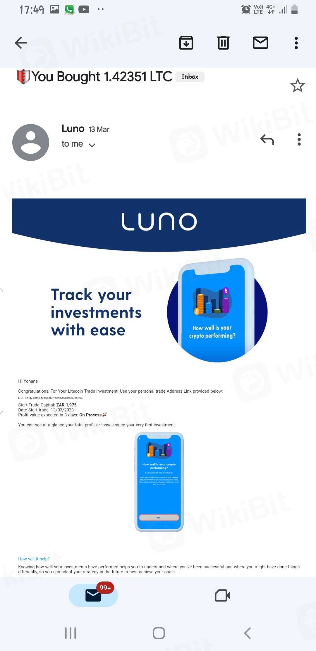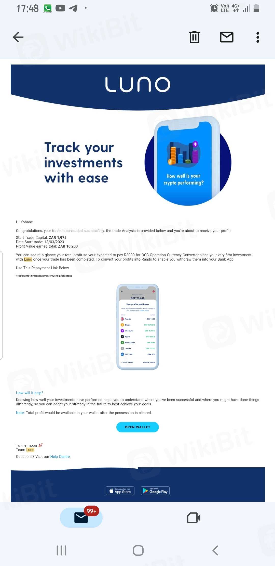 おめでとうございます。取引は正常に完了しました。取引分析は以下に提供されており、利益を受け取る予定です 開始取引資本: 1,975 ザール 取引開始日: 13/03/2023 獲得利益総額: 16,200 ザール 合計利益が一目でわかります。への最初の投資以来、occ オペレーションの通貨コンバーターに 3,000 ドルを支払います LUNO取引が完了したら。利益をランドに変換して銀行アプリに引き出すには、以下の返済リンクを使用してください