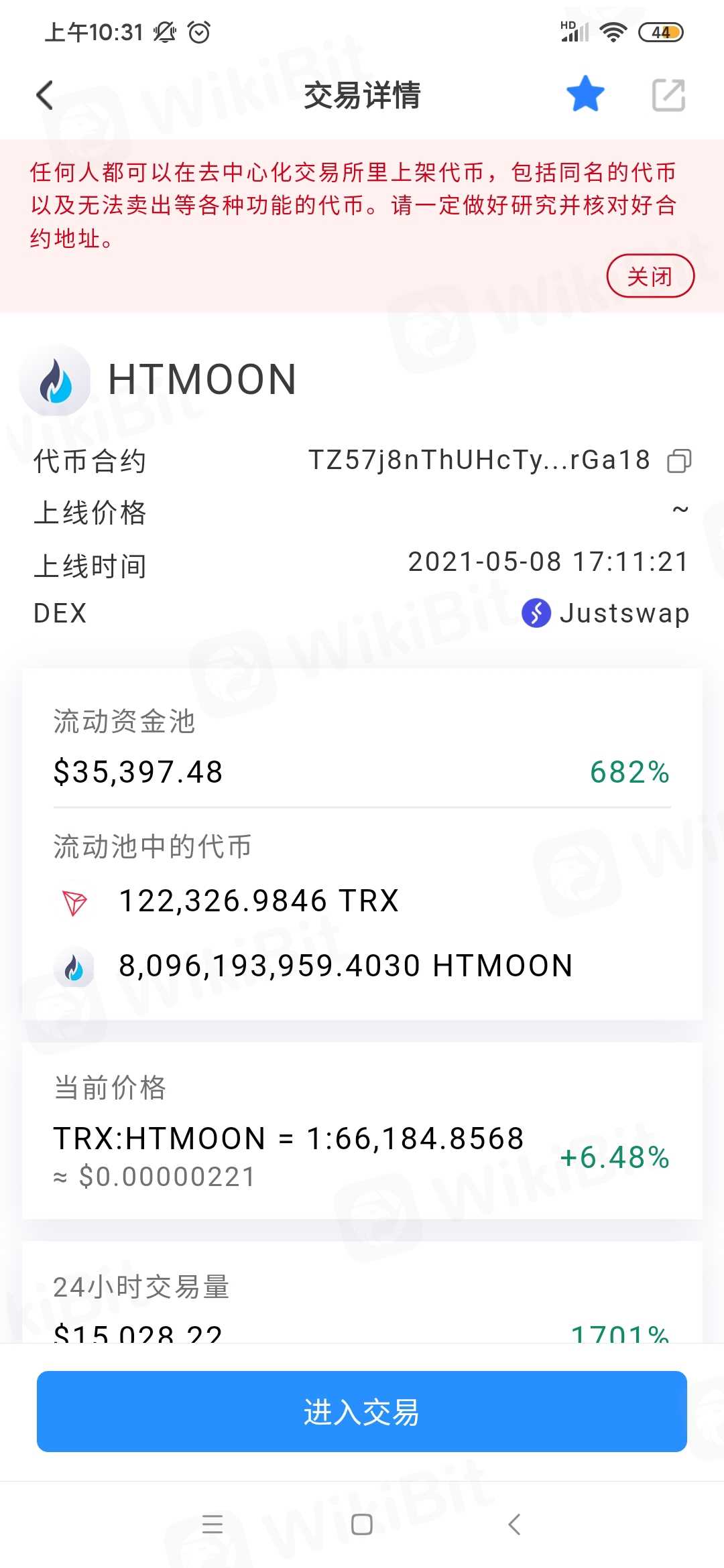 Tp钱包trx交易所兑换htmoon比例为1:67700,结果到账总数量1%