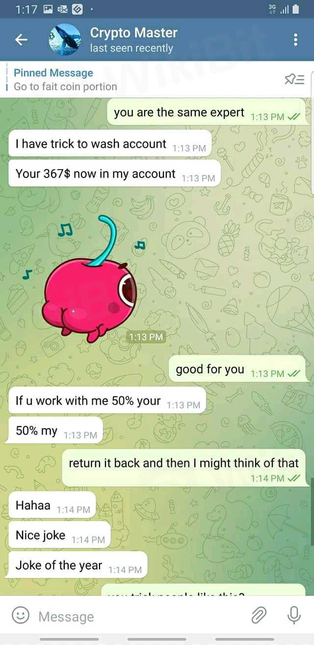 HI GUYS YOU NEED TO KNOW THIS A PERSON CLAIMED TO BE A CRYPTO MATSER ON TELEGRAM IS BUSY SCAMMING PEOPLE EVERYDAY HE IS CLAIMING TO BE AN EXCHANGER UNDER THE (CREX24) HE SCAMMED $367 WITHING A SECONDS.. AFTER HE IS