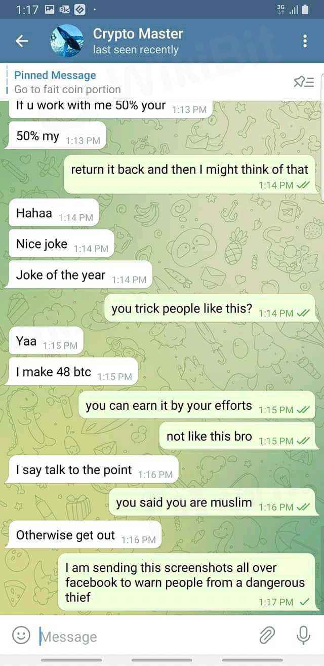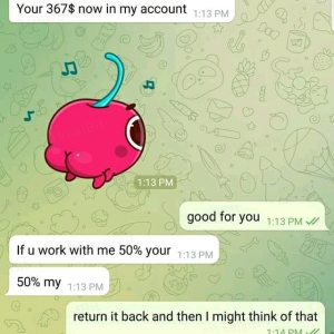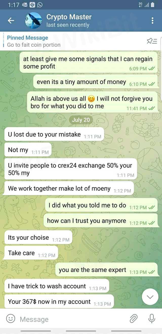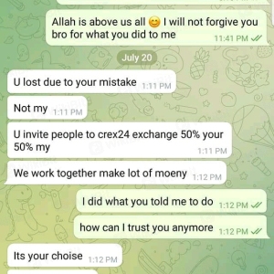 TRYING TO CONVINCE THE VICTIM TO INVITE PEOPLE SO THAT HE WILL GIVE HIM 50% FROM THE PEOPLE HE INVITED THIS IS REALLY SERIOUS SCAMMED BELOW ARE THE PROOF SCREENSHOT OF HOW ITS HAPPENS ALL.CREX24 SHOULD FIND THIS PERSON BECAUSE HE IS PRETENDING TO BE EXCHANGER UNDER THIER COMPANY.