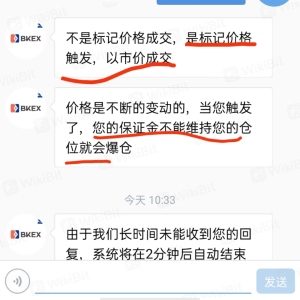 bkEX成了诈骗插针各种理由,强平成交价给你找出各种的垃圾理由,不是委托就是市场不是市场,就是人工恶意