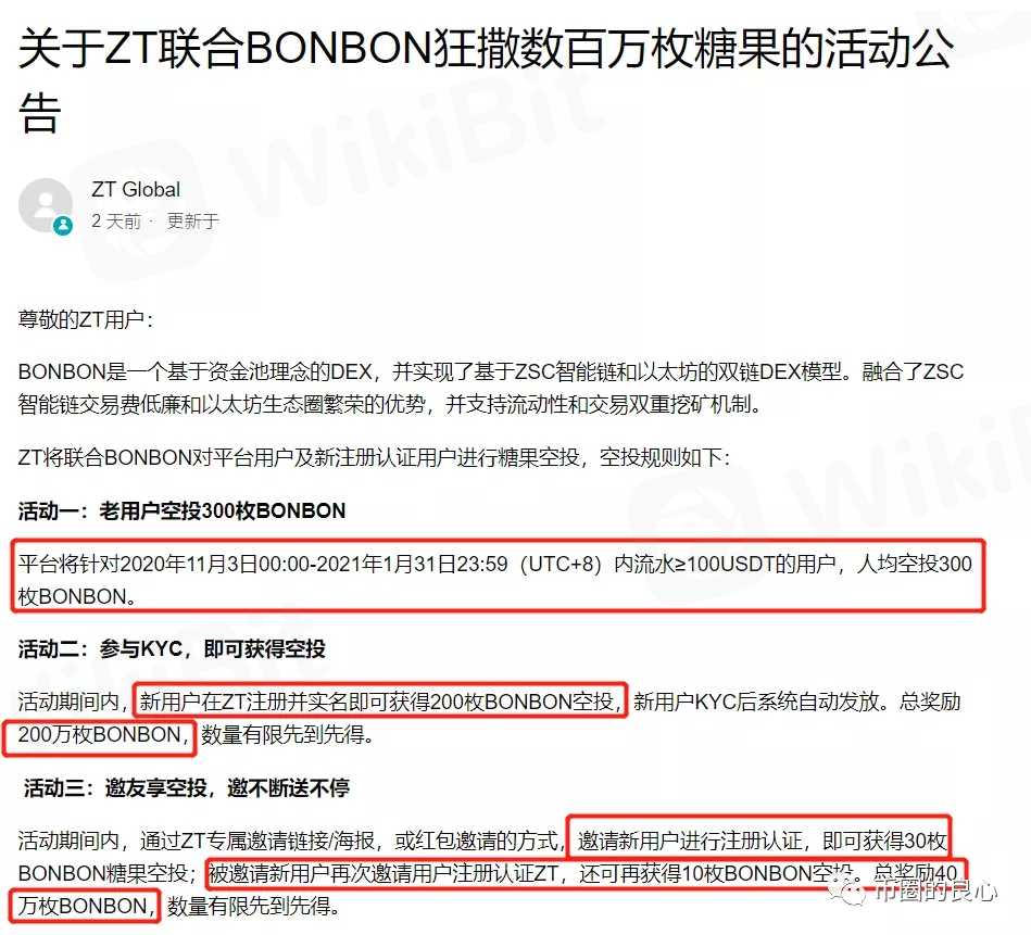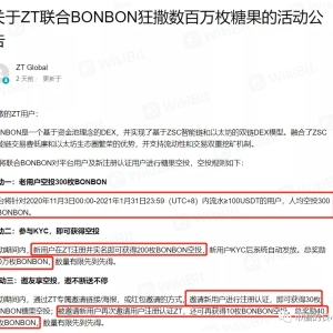 打开zt的首页,你就能看到弹窗:完成注册认证和邀请认证,就能获得bonbon的空投。找到公告,看起来很豪爽,老用户直接空投300,新用户完成实名可以获得200,邀请用户最多可以获得40枚bonbon。看起来在牛年牛市里,zt诚意满满啊,我都有点没忍住去撸。