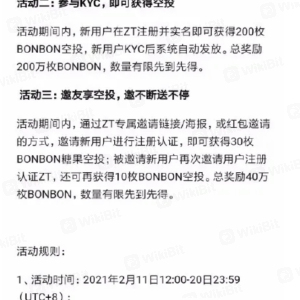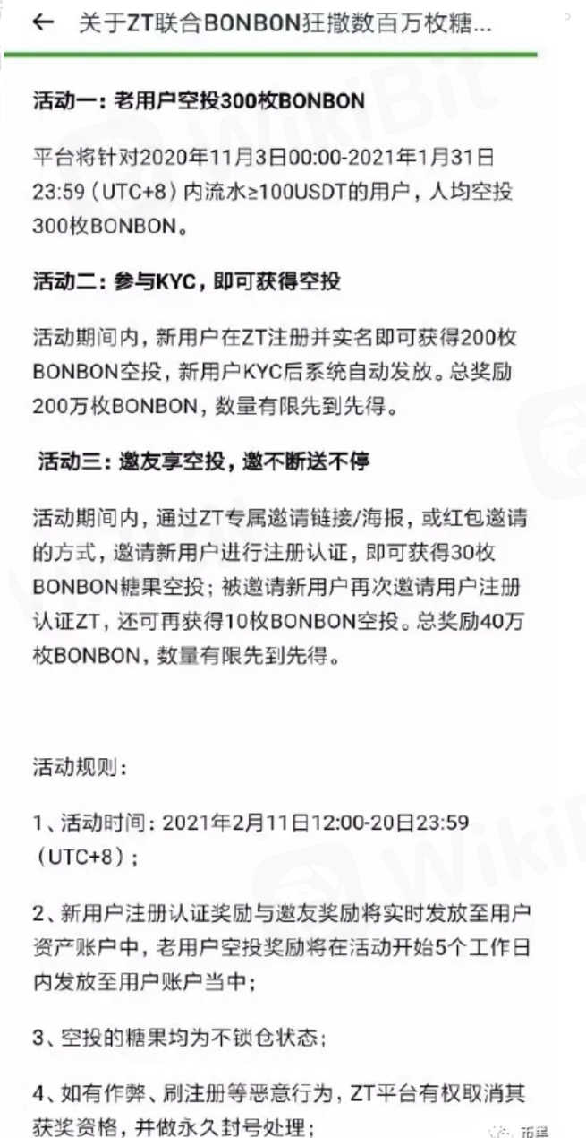 牛市来了,有些之前的野鸡交易所也坐不住了,ZT交易所就是其中之一,现在学了一招。空投糖果来吸引流量,随便发行个代币就随意定价让用户来撸,拉人头还可以获得更多的糖果,其实就是变相的拉人头,吸引投资者来投资,你以为撸了就能提现,你想多了,看看前段时间曝光的D网就知道,500个币分100期释放,每期5个还需要条件限制,能让你们直接撸那是不可能的。当你发现其中的套路,其实ZT扩大知名度,其目的也达到了。