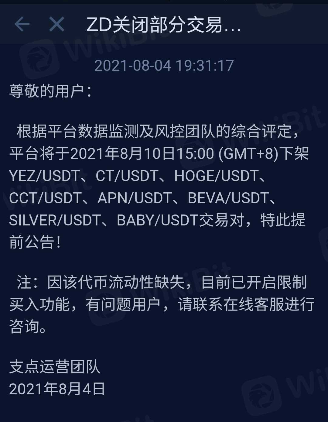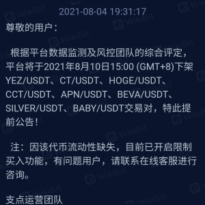 根据支点交易所惯用的剂量是大量上新币,然后砸盘套现后下线清零! 平台数据监测及风控团队的综合评定,平台将于2021年8月10日15:00 (GMT+8)下架YEZ/USDT、CT/USDT、HOGE/USDT、CCT/USDT、APN/USDT、BEVA/USDT、SILVER/USDT、BABY/USDT交易对,特此提前公告!