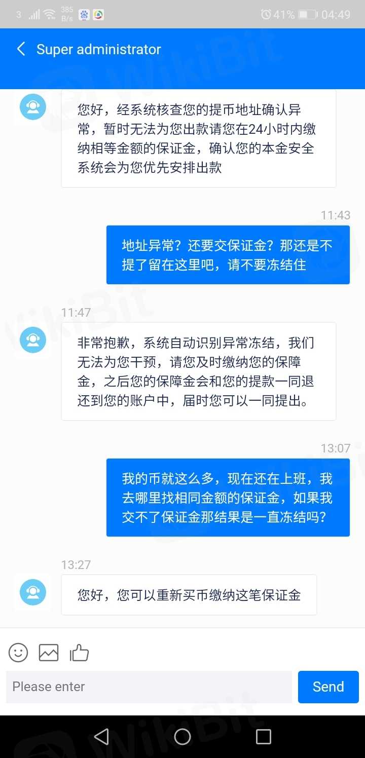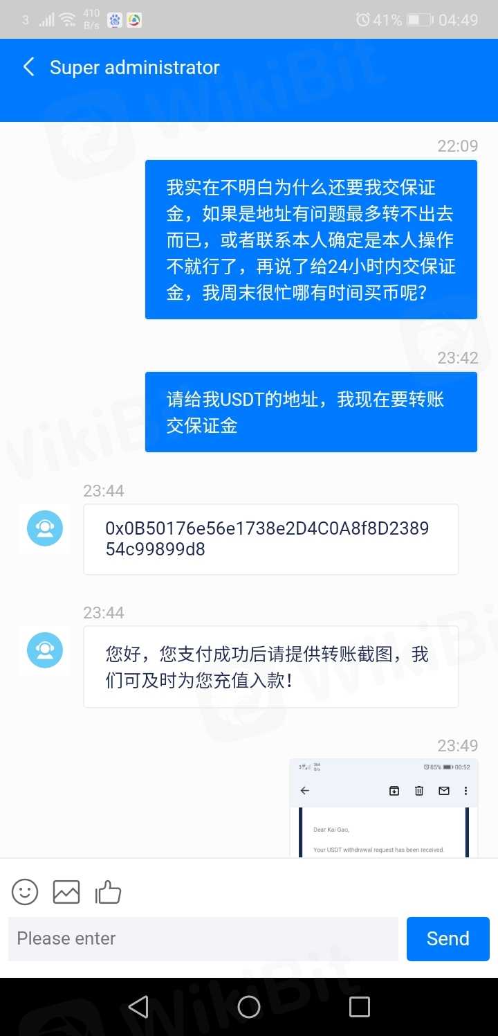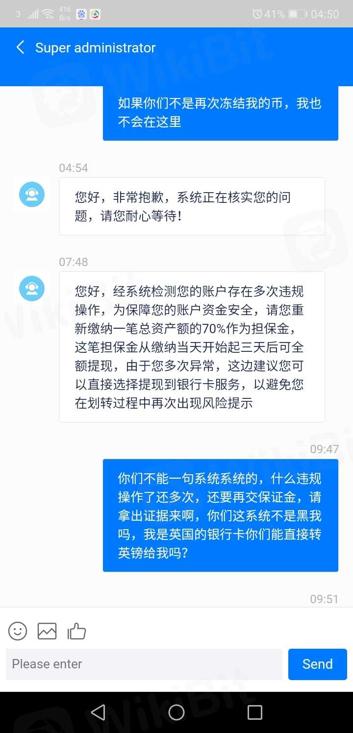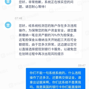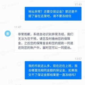 最开始两次提币还算正常,可能因为少的原因,到了第3次提币多一点就被冻结,问了客服叫我等待,后来客服回复说是我提币的地址系统检测到异常所以冻结了,要我交等同金额的保证金,然后我傻傻的交了保证金,再次提币还是被冻结了,再次要我交70%的担保金,那时候我已经察觉到不对劲,因为我提币的地址根本就没问题,他们说我违规操作多次死活不肯解冻,一定要我再交担保金,不然就永久冻结,叫他们拿出来证据我违规操作也拿不出来,根本就是想圈钱跑路的节奏,现在我的5388USDT被他们永久冻结了,币友们请远离这家交易所,一定要到正规的交易所交易,黑平台只能进不给提币太恶心了 ,所以我现在实名举报他们的所做所为,以下就是证据