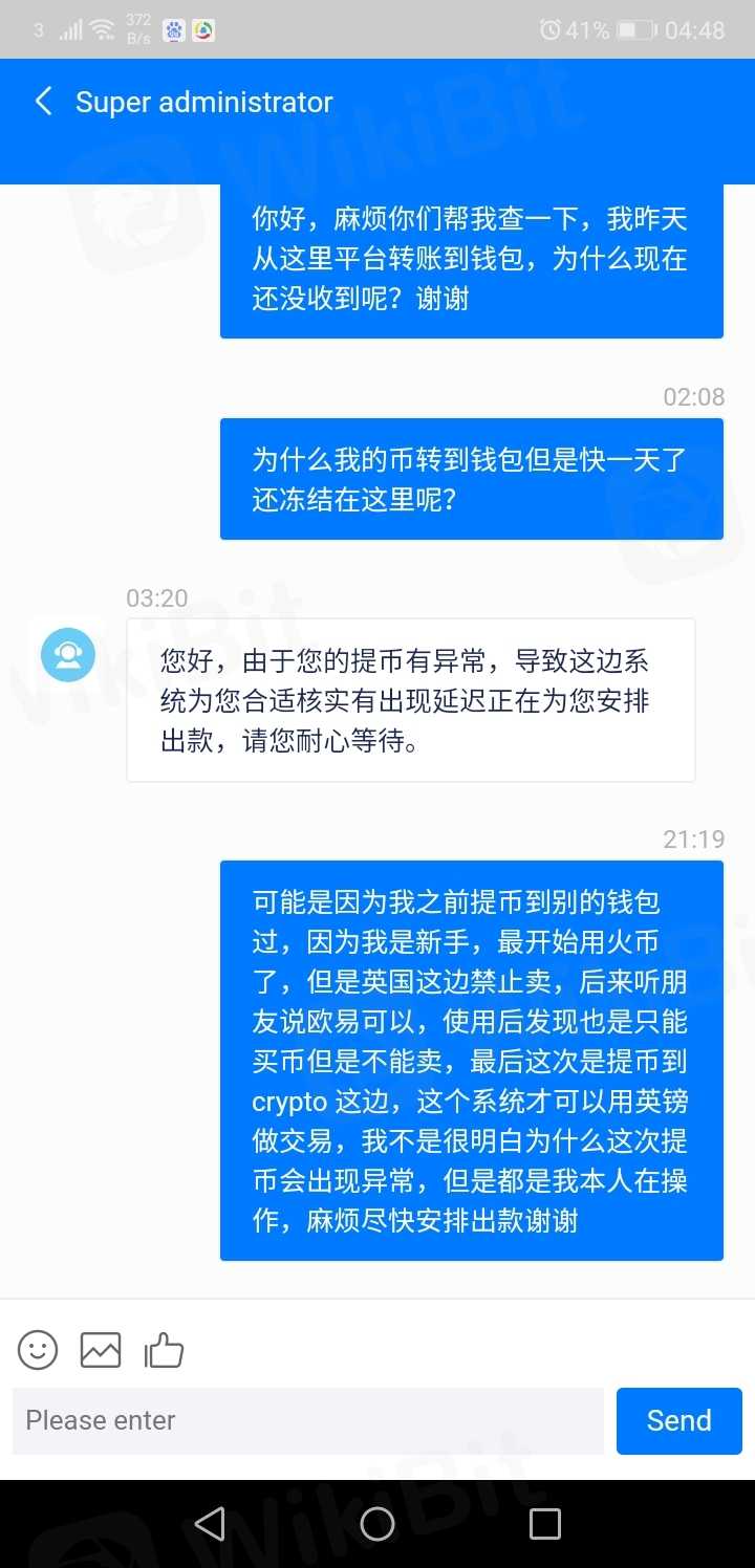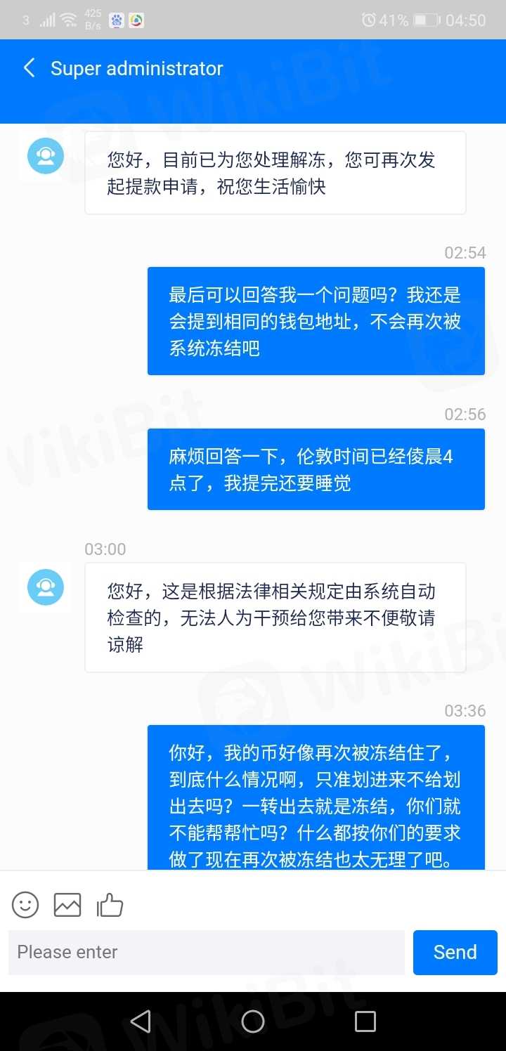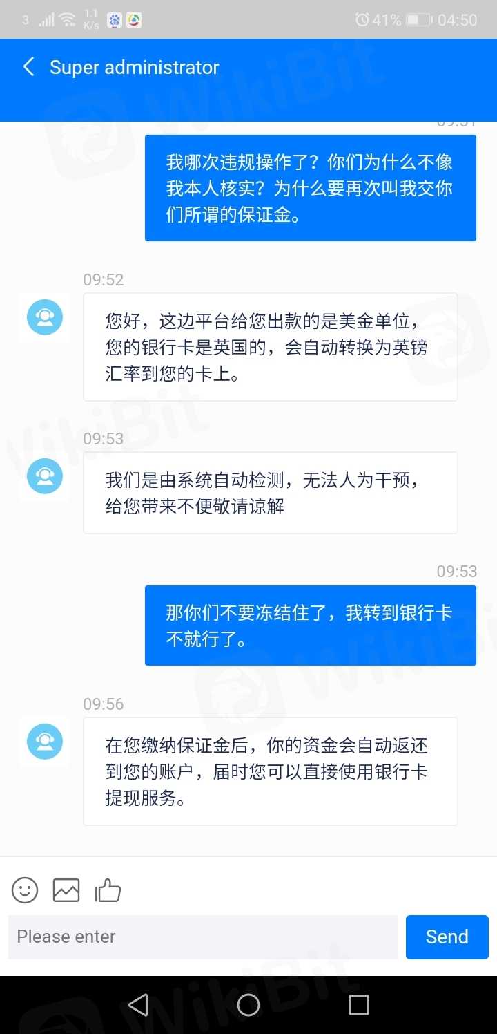 最开始两次提币还算正常,可能因为少的原因,到了第3次提币多一点就被冻结,问了客服叫我等待,后来客服回复说是我提币的地址系统检测到异常所以冻结了,要我交等同金额的保证金,然后我傻傻的交了保证金,再次提币还是被冻结了,再次要我交70%的担保金,那时候我已经察觉到不对劲,因为我提币的地址根本就没问题,他们说我违规操作多次死活不肯解冻,一定要我再交担保金,不然就永久冻结,叫他们拿出来证据我违规操作也拿不出来,根本就是想圈钱跑路的节奏,现在我的5388USDT被他们永久冻结了,币友们请远离这家交易所,一定要到正规的交易所交易,黑平台只能进不给提币太恶心了 ,所以我现在实名举报他们的所做所为,以下就是证据