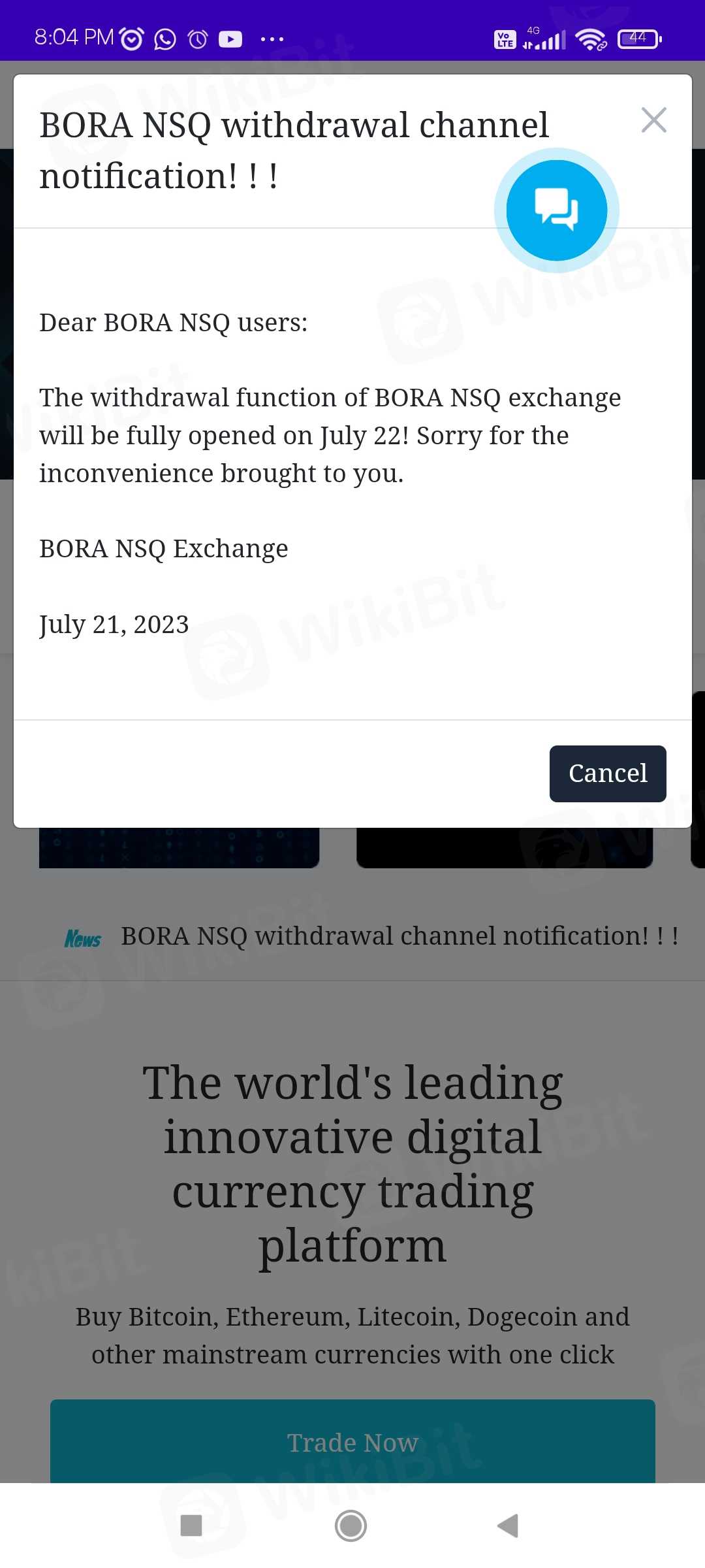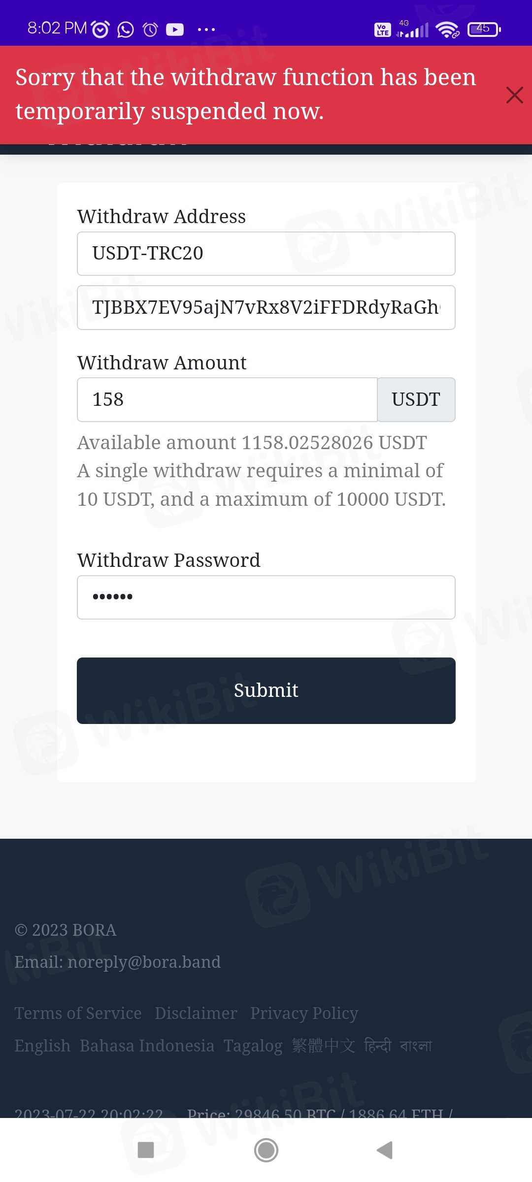 It was working fine for the past one year. one fine morning they blocked all withdrawal. Now they want to activate Bora account by paying 100 USDT. Even paying 100 USDT the accounts are not yet activated or withdrawal is not happening. They are Postponding the withdrawal date endless times. They are clearly cheating. Please spread this information, so that someone can save the money.