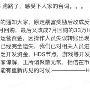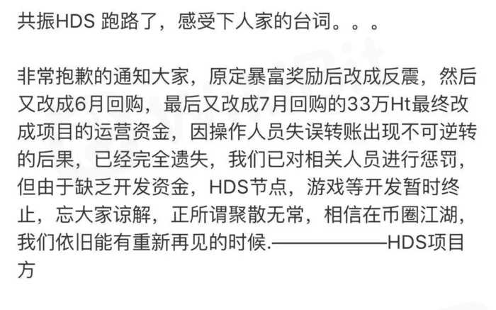公告称由于人员转账失误出现不可逆转的后果,33万HT完全遗失,因此停止HDS开发,“相信在币圈江湖,我们依旧有重新再见的时候。”33万个HT,时价有850万RMB之多,就这么一纸公告消失了,理由不能再奇葩。