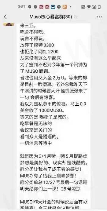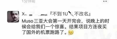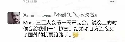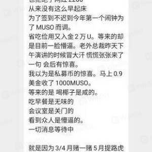 昨天很多微信群成员爆料称,“Muso公链”的操盘手跑路了,留下一脸懵逼的会员面面相觑,不知如何是好,希望能够曝光一下这个项目!据会员反映,这个项目方也是一个奇葩的存在,3月27日项目方在海南三亚刚刚召开了会员见面会,大家都在等待27号公链有更大的利好落地。可是没想到第一天开会结束。项目方说的晚上给大家个“惊喜”。没想到真项目方直接连夜买国外的机票跑路。这个项目方也真是缺德,不敢常理出牌,一般都是悄悄的跑路,这波操盘手竟然把大家聚到一起宣布跑路!简直是挑战会员的智商啊!Muso上线之初贴上一个公链的标签,然后号称Defi2.0。又是DEFI,又是去中心化。但是项目的模式就是存币生息,所有的包装都改变不了它圈钱的真相!现在操盘手真喜欢用“公链”得概念来欺骗投资者,大家一定要睁大双眼,不要再被这些韭菜收割机欺骗了!