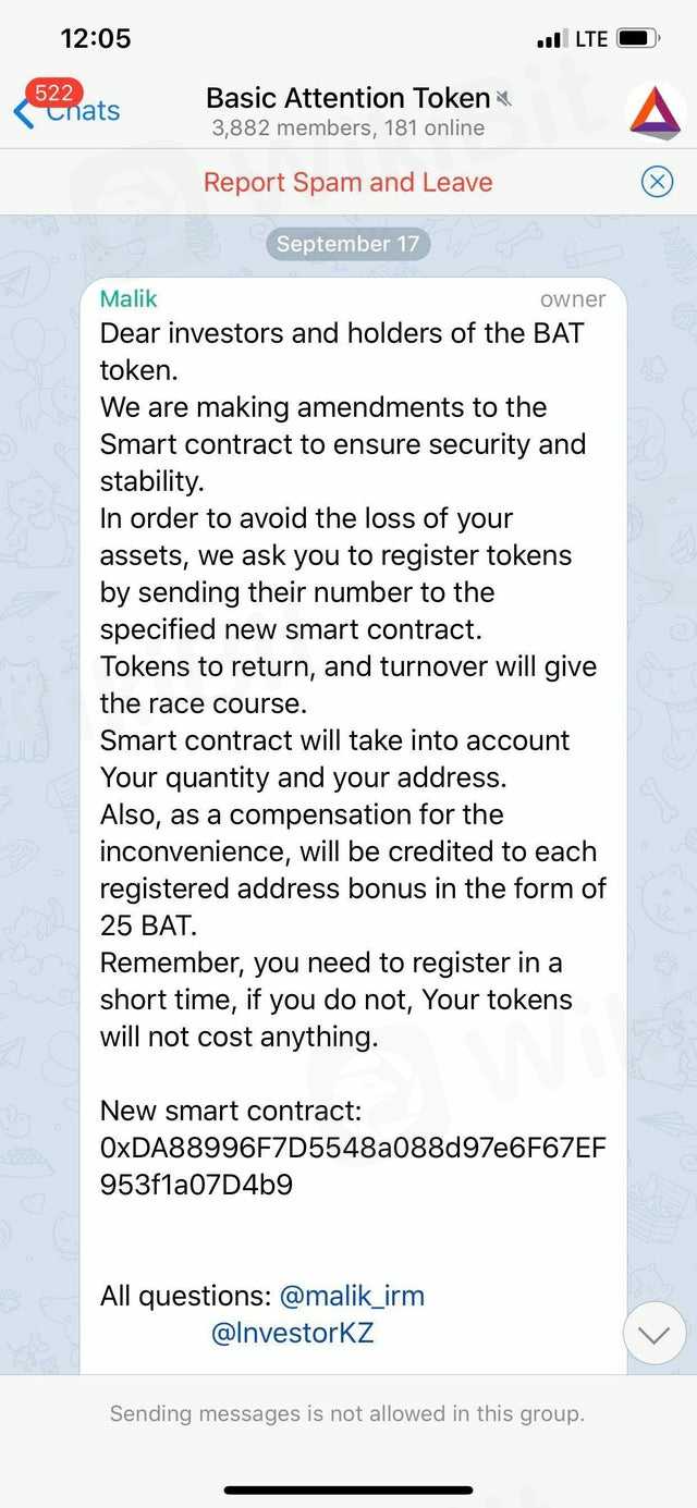 WARNING: There is a group named basic attention Token on Telegram scam stating that Bat have created a new BAT smart contract, and that you are required to send BAT to an address in order to secure your BAT. This is NOT real; do NOT send anything to this address. Because I sent my Bat but nothing change in my account Please be careful and always double check which channel you are in.