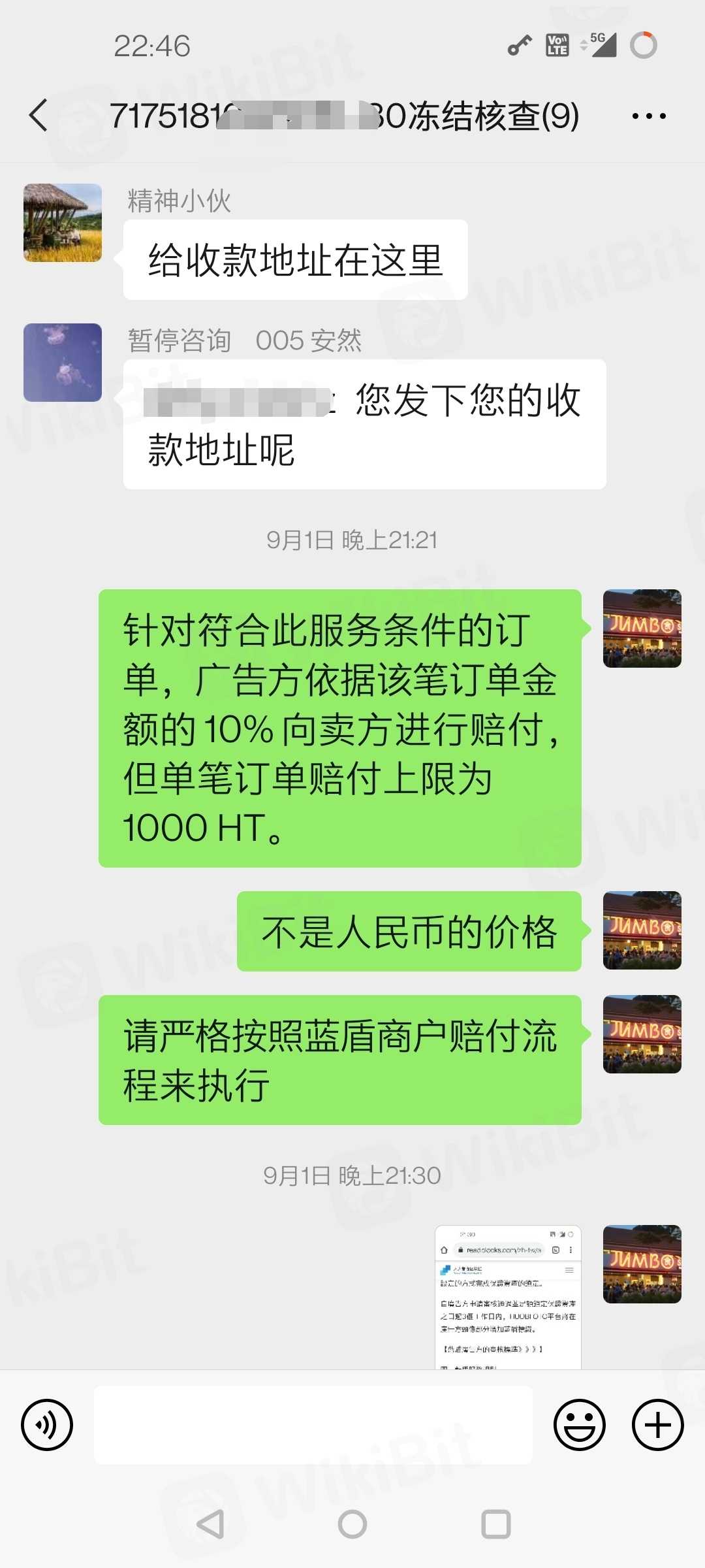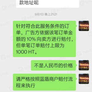 2020年7月份在火币上找蓝盾商家交易后被河南警方冻结,经过实地警局笔录,警方告知是因为蓝盾商家何鑫的资金存在非法问题。按照蓝盾商户赔偿协议,提供了几个证据,一是警方的通话记录有提到何鑫。二是有警方的联系方式和工作地点,方便火币调取信息。 三是交易记录里有何鑫的账户,且一年内没有其他交易记录。 四是何鑫交易记录里有多名用户都被河南警方冻结,火币可以自查。 在证据充足的情况下,经历了一年多火币仍不启动赔付流程。之后经过协商,蓝盾商户后台老板小马驹同意赔付1000HT,但是以被冻结时的HT价格赔付。本人拒绝该条件,如果一年前立即赔付是可以接受的。但是一年后还按此价格是不能接受的,要求按照赔付条款赔付1000HT。火币至今不按赔付条款正常赔付。