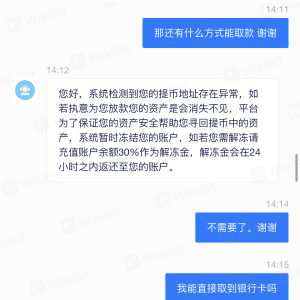 我有8万吧美金在kkcoin 平台。刚开始取一万,客服告诉我提币地址异常要我交30% 的钱解冻。我没给 后来直觉冻结了我的账号。