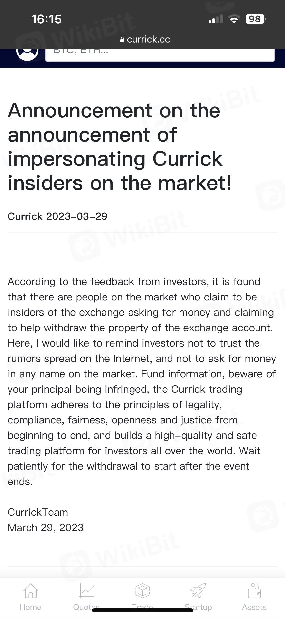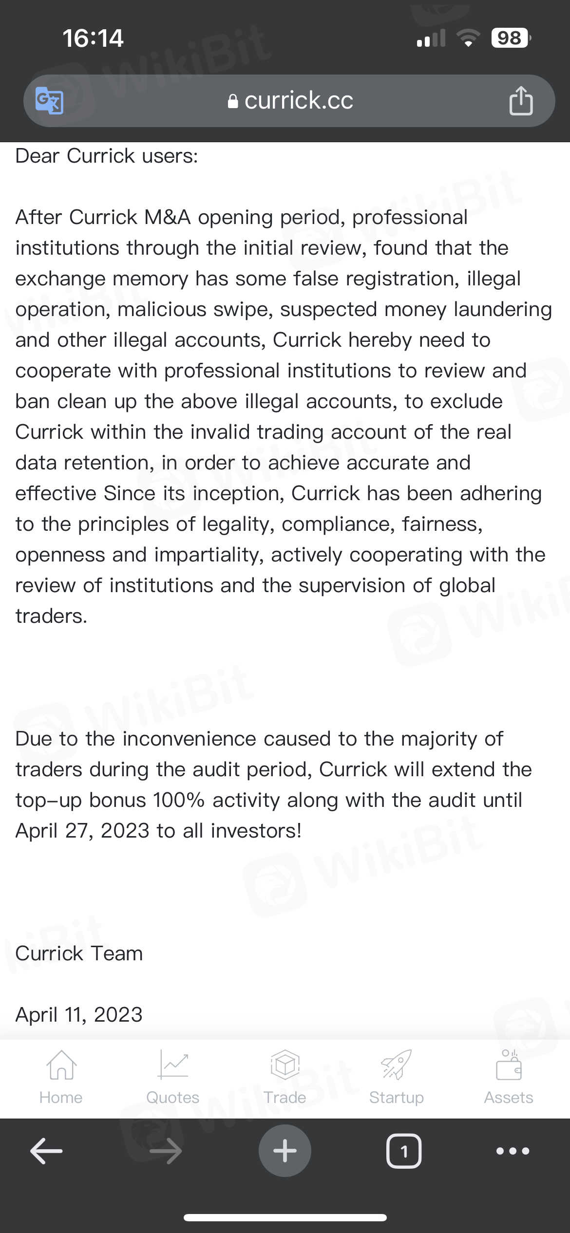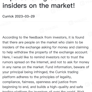 Currickได้ห้ามการถอนเป็นเวลา 15 วัน เขารับประกันว่าวันที่ 11 เมษายนจะเปิดขึ้น แต่ไม่ได้ยกเลิกการห้ามการถอน ตอนนี้เขาฉ้อโกงผู้คนนับแสนในตุรกีโดยบอกว่าเราจะเปิดวันที่ 27 เมษายนและโกหก Currick เป็นสแกมเมอร์