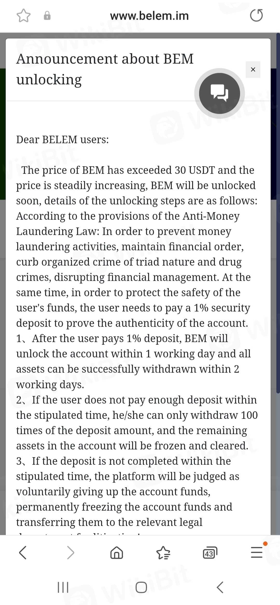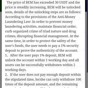 Now that it has reached above 30 usdt, they announce that we should recharge our account with 1% of the total capital so that the bem currency is freed.