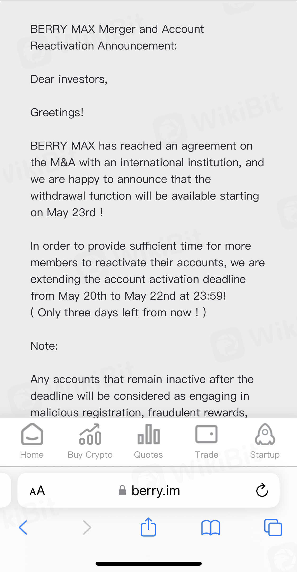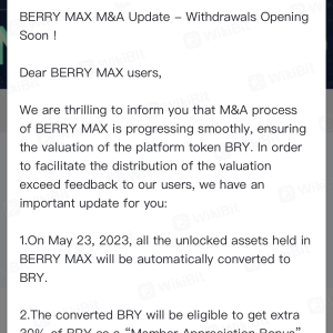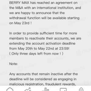 I was introduced to Berry and invested money. Few weeks after withdrawals were suspended, we were told to deposit further $50 to unlock our accounts for verification purposes, they took all the USDT tokens on our assets now and we are told withdrawals are unlocked again but we have to wait 90 days to get our USDT tokens back. All this is done without our consent.