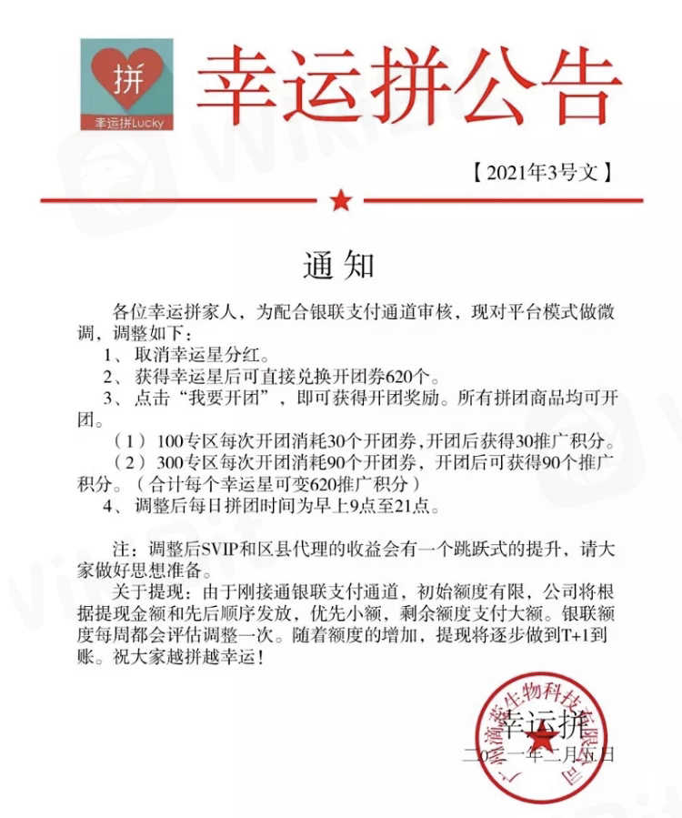 开始套路了,目前已经取消了幸运星的提现功能,会员拼团得到的幸运星只能换成开团券。周五发的公告说审核银联支付通道,其实完全是忽悠。之前21号-24号的提现到了之后,很多会员25日的提现到现在还没到账。说是支付通道问题,实际就是操盘手控制资金兑付的速度,控制了速度就等于控制了资金流量,这样操盘手才能剩更多的钱跑路。前期参与的会员很多都已经下车远离了,现在还没下车的会员那就十分危险了