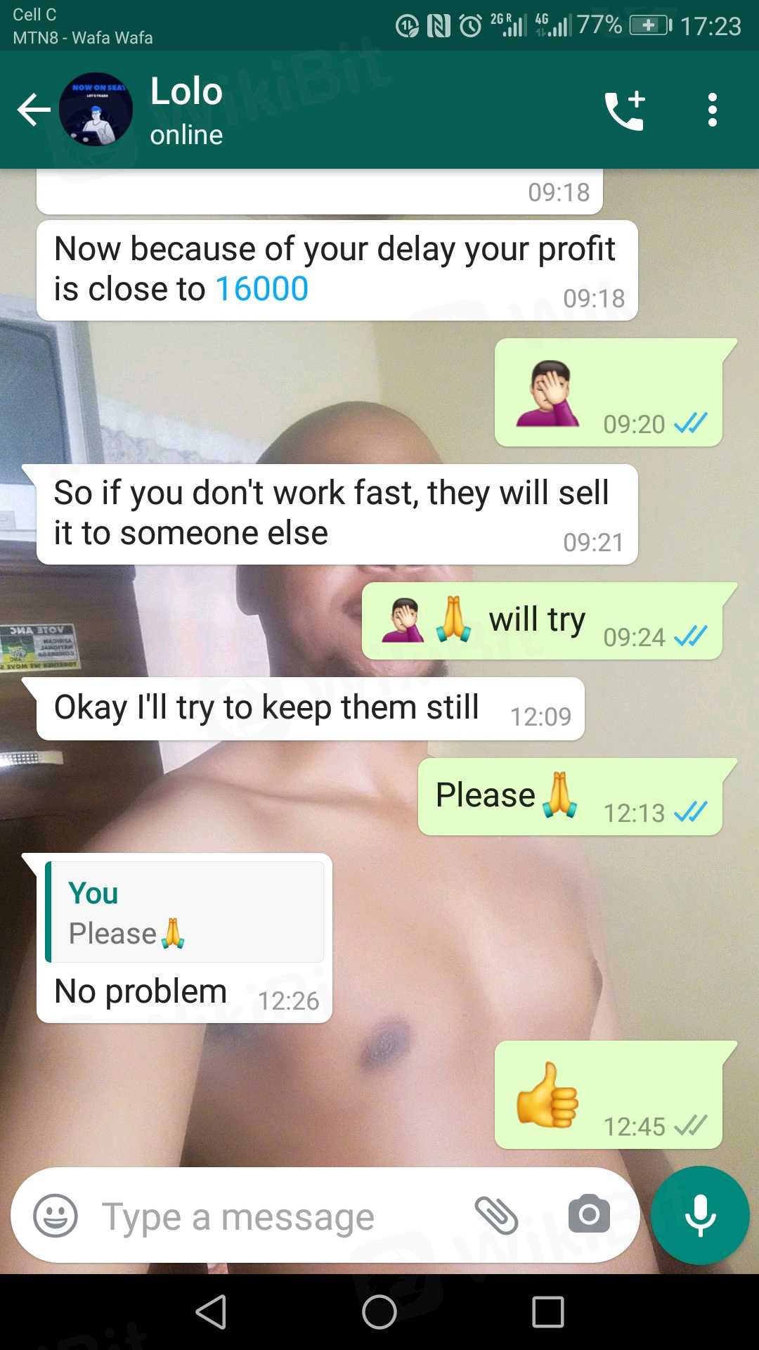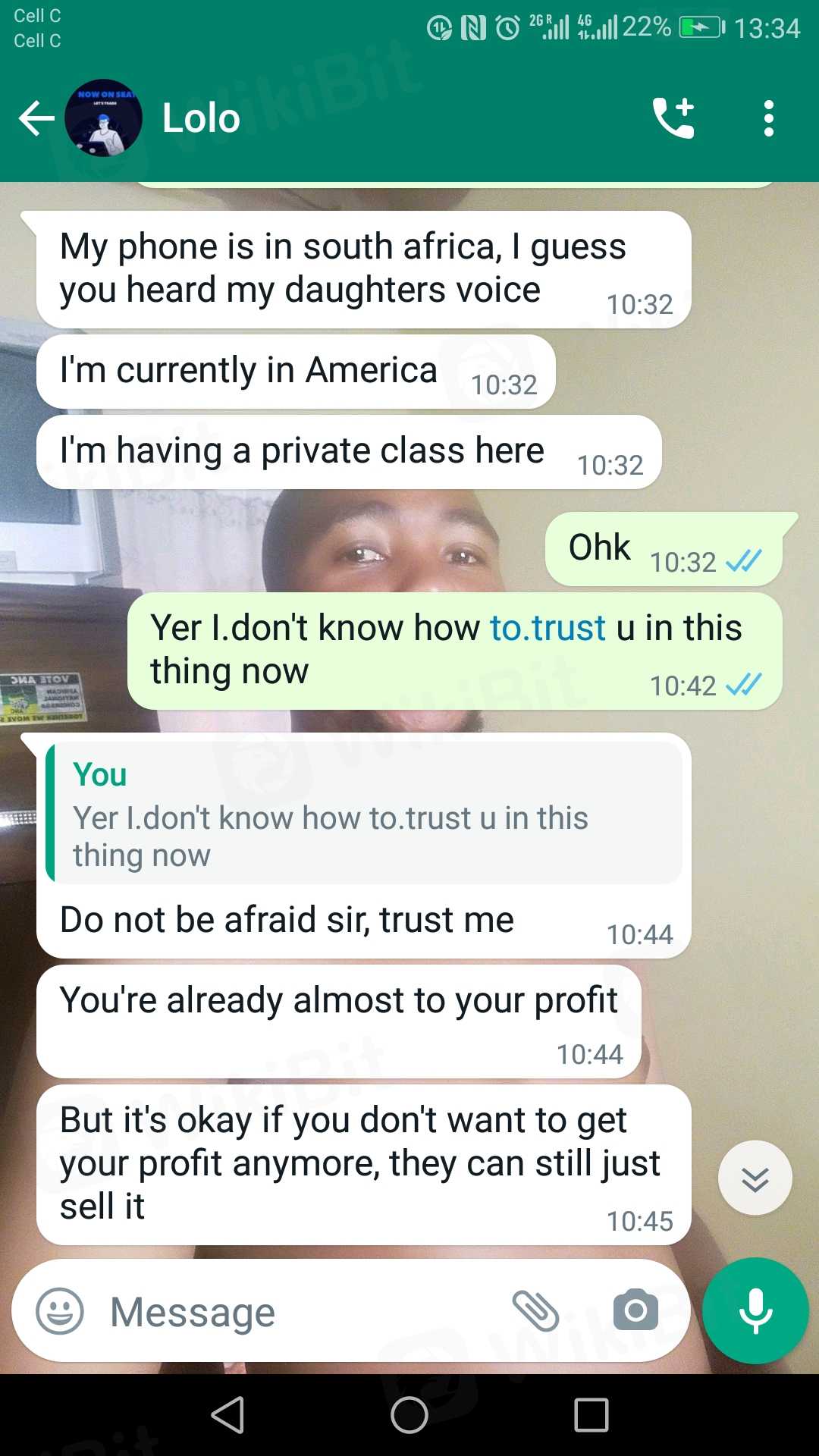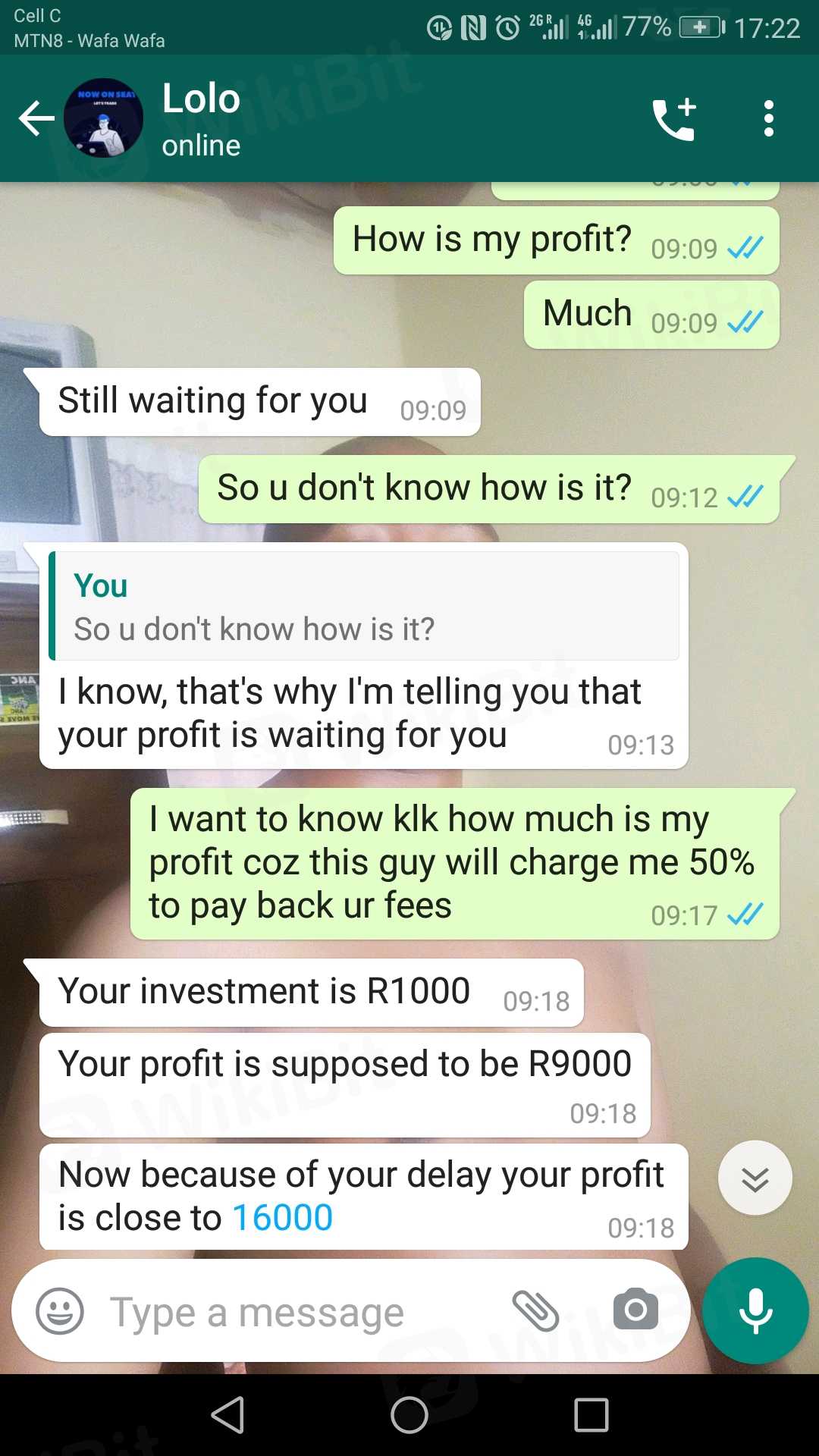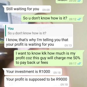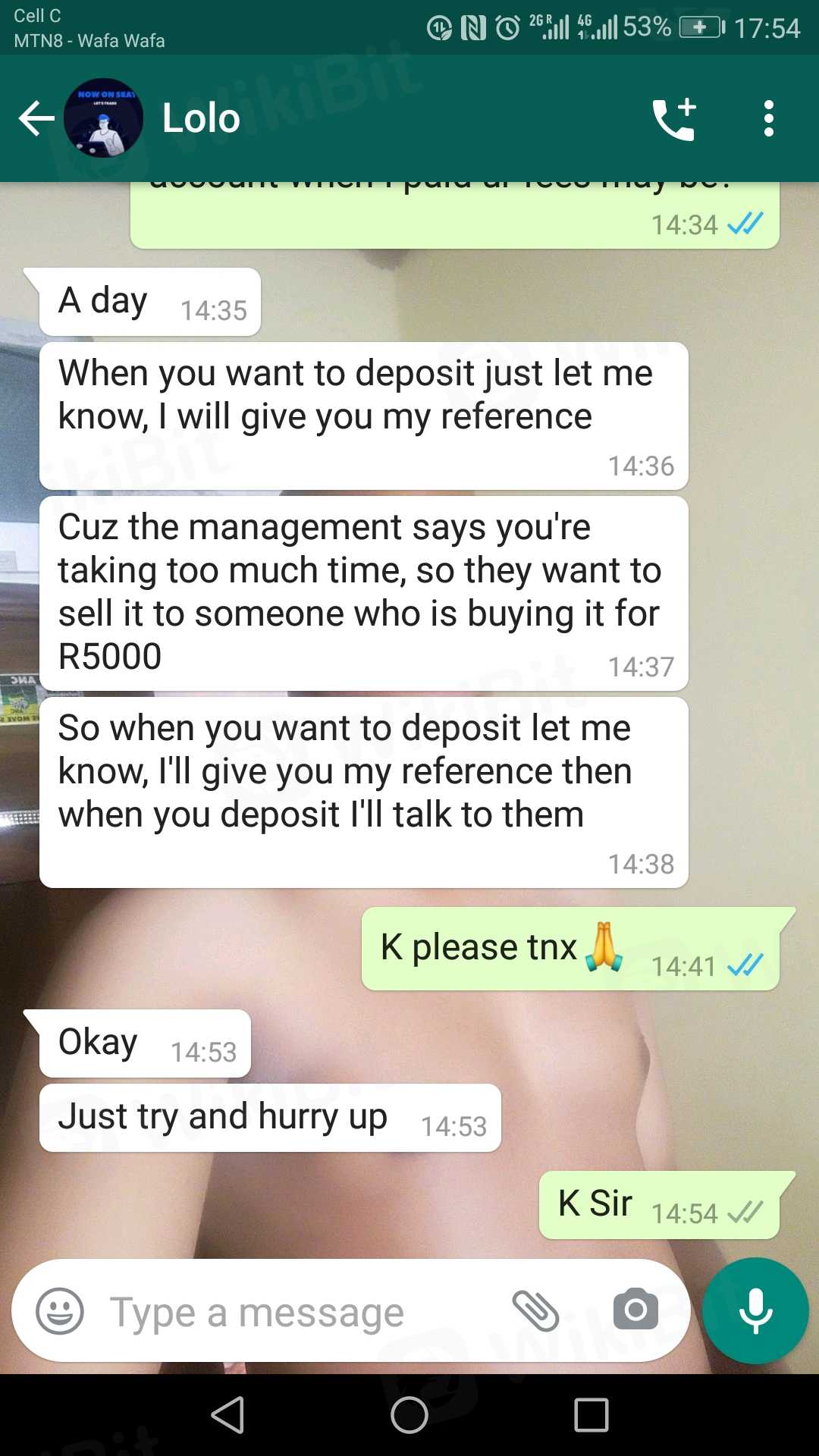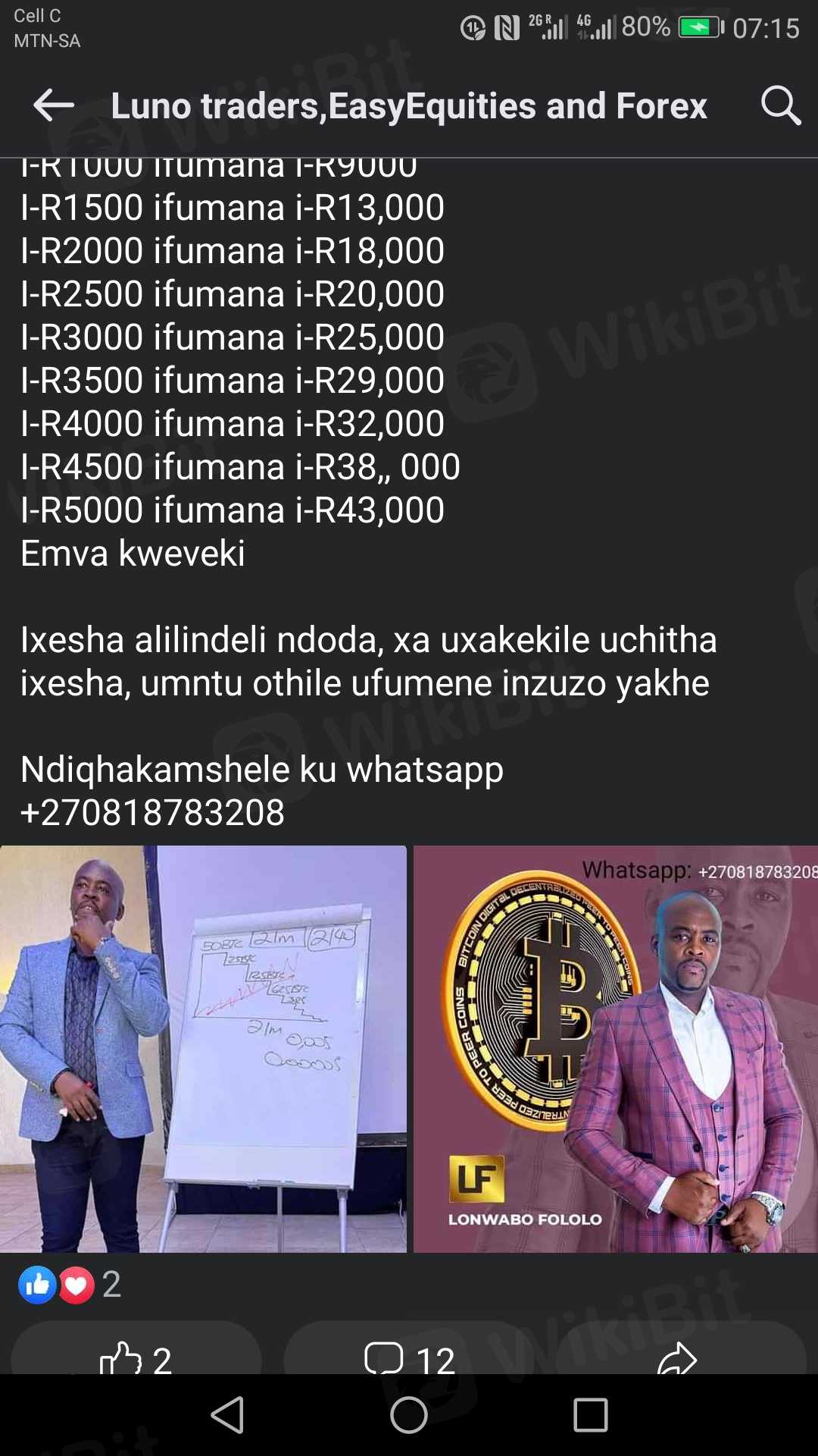 The guy called himself Lonwabo Fololo scammed me R2500.I send R1000 via Luno wallet then he asked me R1500 he said his fees for helping me in my trading.He block me on what's app when I ask my money