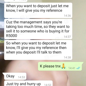 Anh chàng tự xưng là Lonwabo Fololo đã lừa tôi R2500, tôi gửi R1000 qua ví Luno, sau đó anh ta hỏi tôi R1500, anh ta nói phí của anh ta vì đã giúp tôi giao dịch. Anh ta chặn tôi trên ứng dụng gì khi tôi hỏi tiền của tôi.