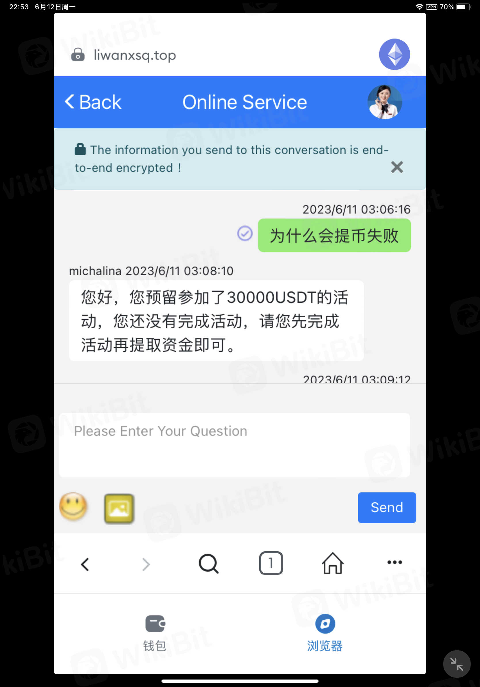 初始小额可以提取,后来被引导参加了一个活动,要缴够30000u才可以提,现有12000u在里面