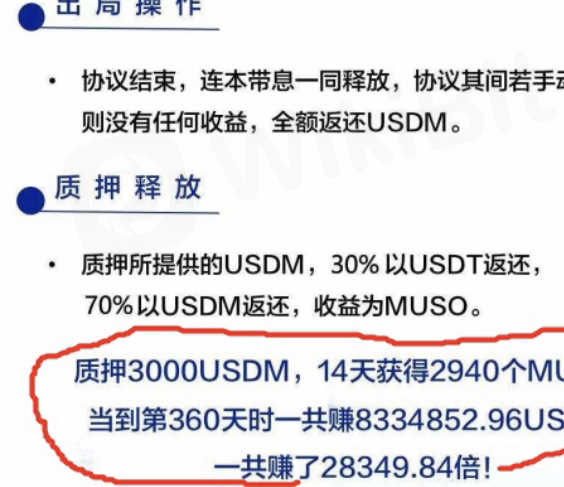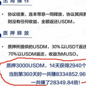 锁仓有门槛,提前提取无收益。 这也是资金盘常用的锁仓方式。 当然是为了拖更多时间,好舒缓提现,或者方便跑路。 最后一段亮了: 质押3000USDM,到第360天可以赚8334852.96U。 28349.84倍!