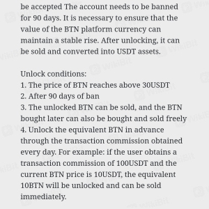 资产在没有通知的情况下转换为 BTN,更糟糕的是它一直被锁定,直到达到以下目标:1. 达到 30USDT时,2. 90 天后解锁,3. 当我们邀请更多人加入交易平台时.