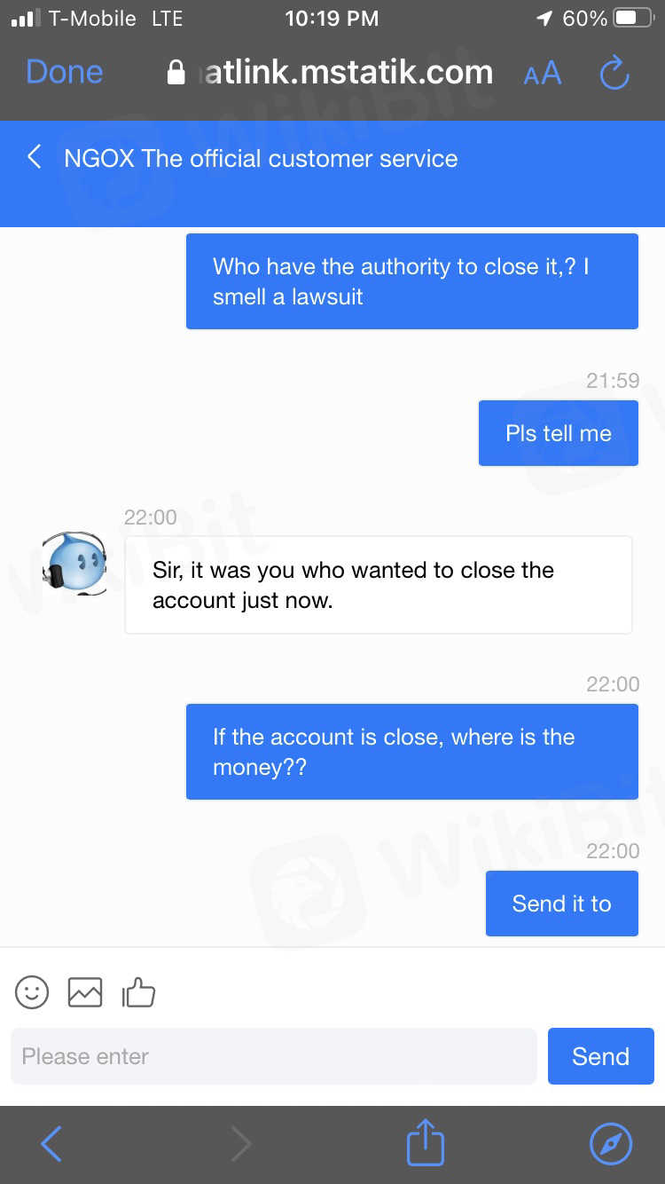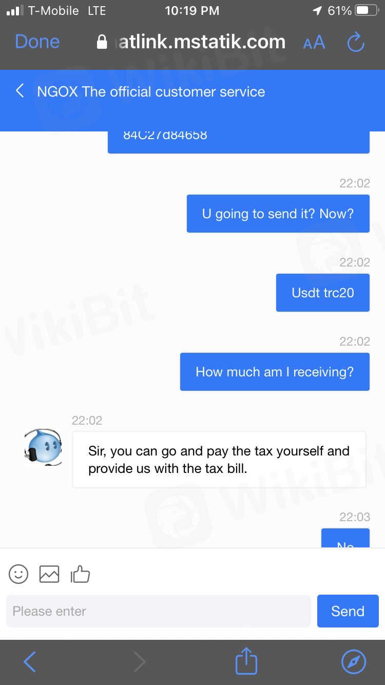 Fellow traders, pls stay away from NGOEX, to recharge or withdraw, u have to go through customer service, they are either in on it or been instructed to use those tactics. they uses words like ( sir, you have to wait for the operation flow to finish first ) to everyone, I got a friend there, they use it on everyone, don’t take that, stay on the line and insist, for small amounts, maybe I get it back, for big amounts, don’t even think about it. I try to withdraw 100k and guess what, (sir, I got to pay your tax first) I was shock, don’t u take it out from my account? and he just keep repeating to pay tax first, all the while, say after submitting my tax receipt, I will get a tax return form, but where is my p/l statement. so I ask, how much tax should I pay? He came back after a while and type I need to pay tax on 2.3 million!!!! how the heck did they come out with that figure, I ask can I see it, and he go on repeating u need to pay your tax first. and finally I inquired about the procedure to close and he close it without tell me and say it was me who want to close it, even when u close it, I don’t see a check or anything, just the same thing, u need to pay your tax and present a tax receipt to them, how now that I even lose access to them. you can even visit the exchange, there is no address anywhere. the contact person stop talking and boy, don’t be a scammer , look at how they age check photo below, guys, if you know the address of this exchange, I would love to know,