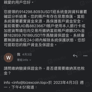 IG上認識的網友,一開始只單純聊天,後來網友說有投資虛擬貨幣,而且都是賺錢,希望我能一起投資,才能跟他有共同話題,一開始我只有投資10萬台幣,後來網友一直不斷說服我加碼投資,獲利才會增加,而且還跟我保證承諾發毒誓一定會轉回台幣到我的帳戶,到了我要出金的時候,便要求繳驗資保證金20%,我問網友為什麼會這樣,網友說這是正常現象,如果沒繳就沒辦法出金,根本就是詐騙,請求協助