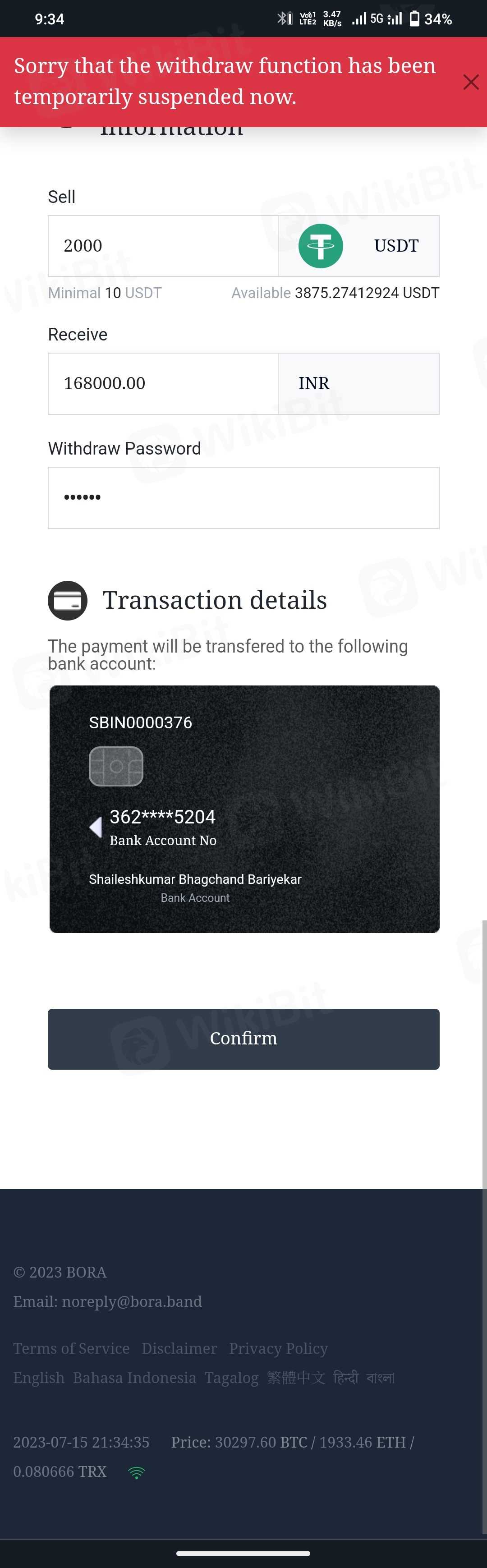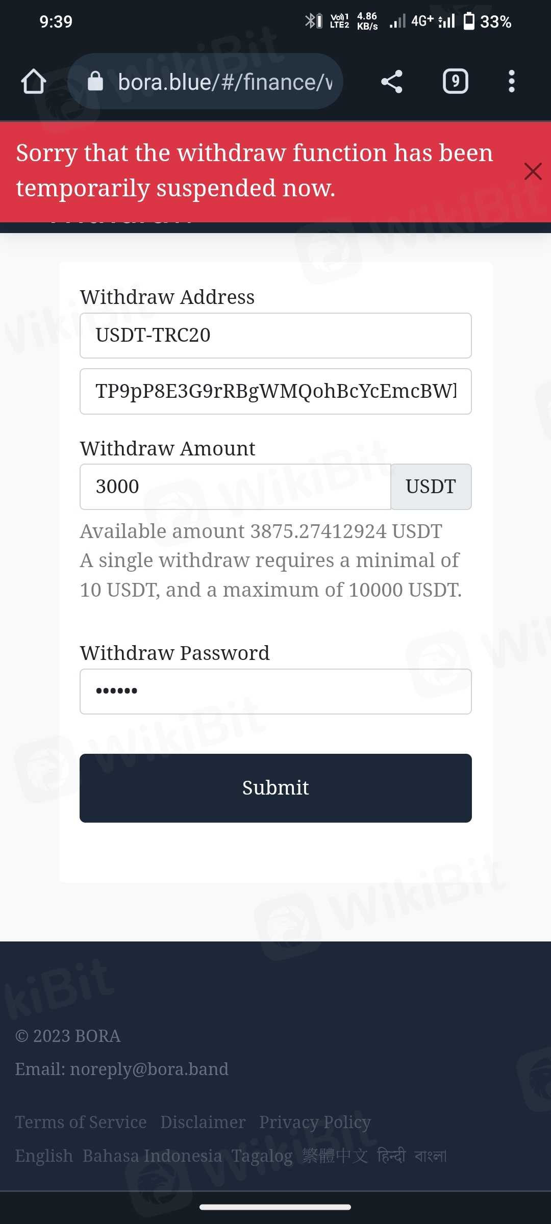 Form 26 June 2023 Bora has stopped withdrawal without prior notice, now published new notice to, all account will be band after 31 July, if recharge in 100 USDT so account will activate if not they permanently band account, Big scam is going on in Bora Band