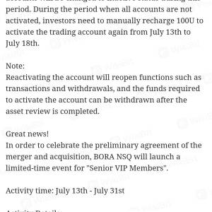 2023年6月26日Bora已停止提款没有预先通知,现在又发布新通知,7月31日后所有帐户将被禁止,如果充值100 USDT,则帐户将激活,否则将永久禁止帐户,Bora在进行一场大骗局