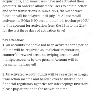 i have 7500usdt in my account, but they denied withdrawals.... in earlier they demanded to put 100 usdt for reactivating withdrawal , me and my friends deposited that 100usdt, Again Bora cheated everyone, till now bora not opened withdrawal...