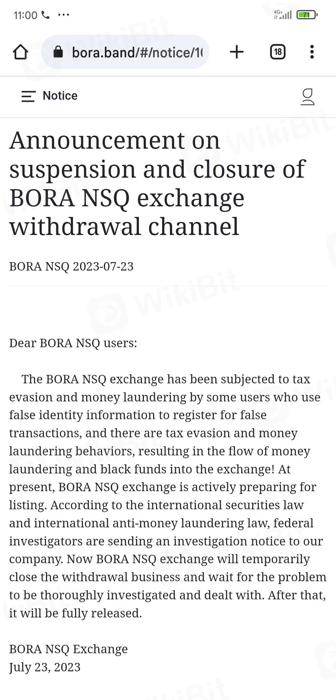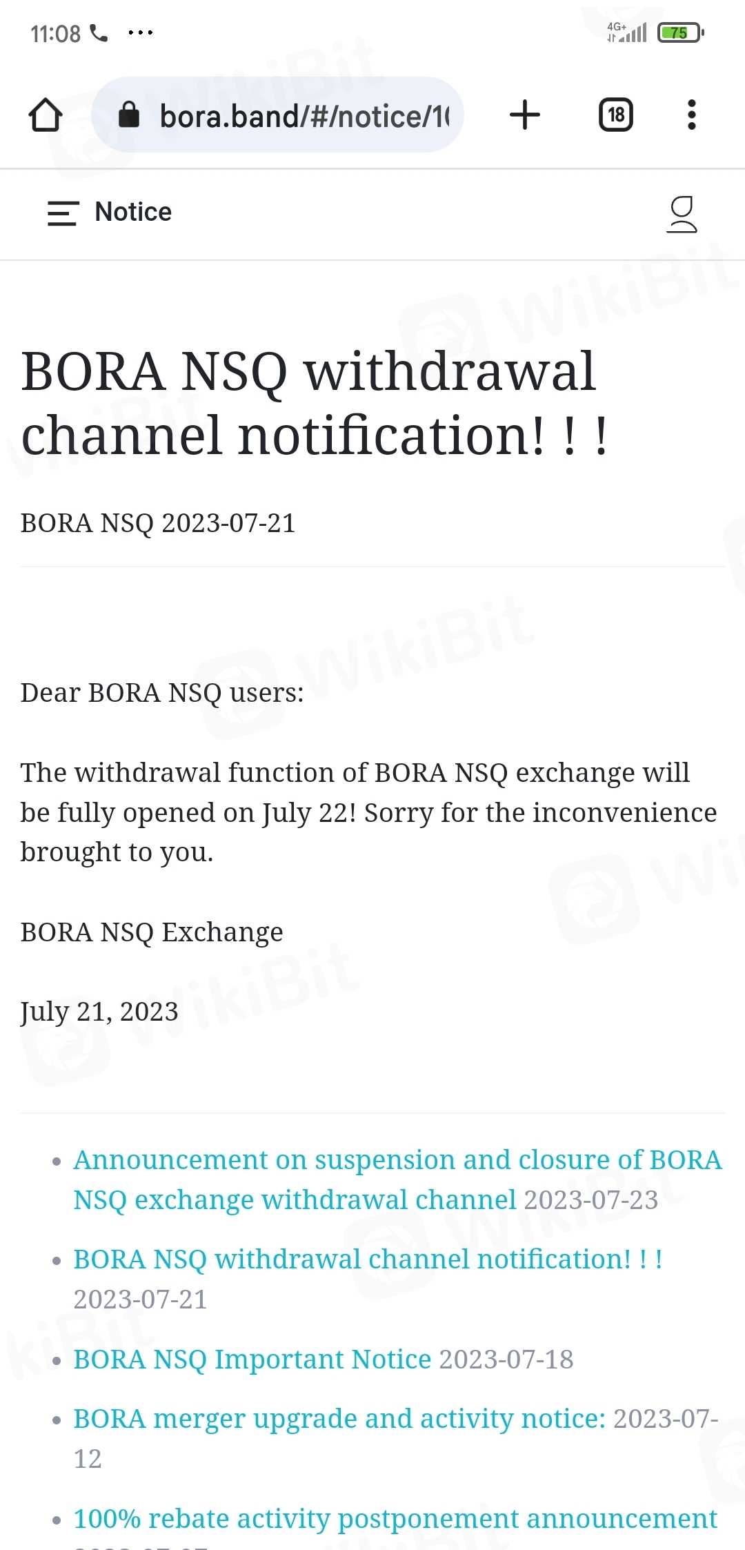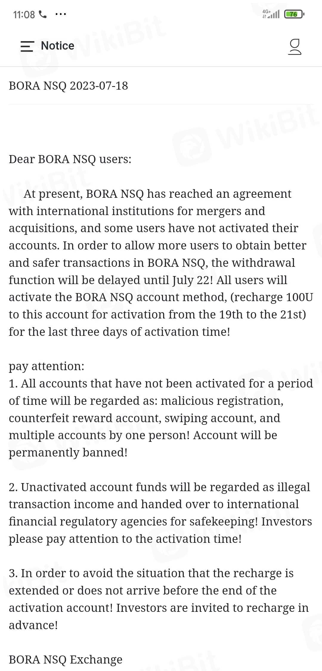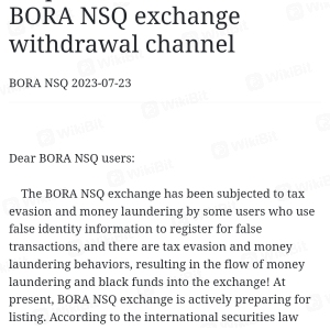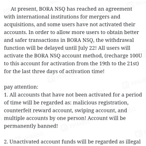 Bora 自23 年 6 月 31 日与某公司结盟后就无法出金,他们还要求充 100 usdt 来激活账户。Bora 在 22/07/2023 发出出金通知,然后 23/07/2023 发出新公告,出金暂停,关闭 BORA NSQ兑换通道。请尽快解决此问题。