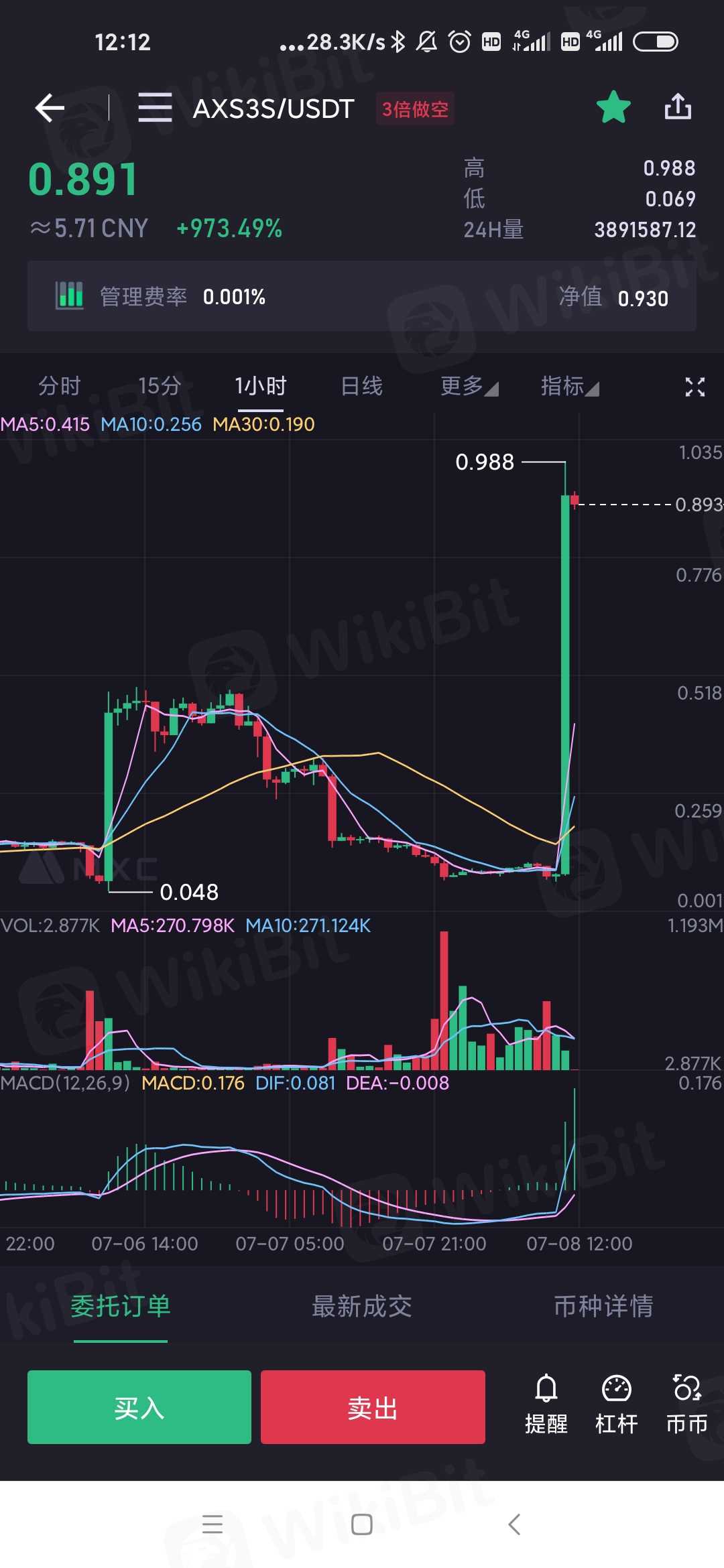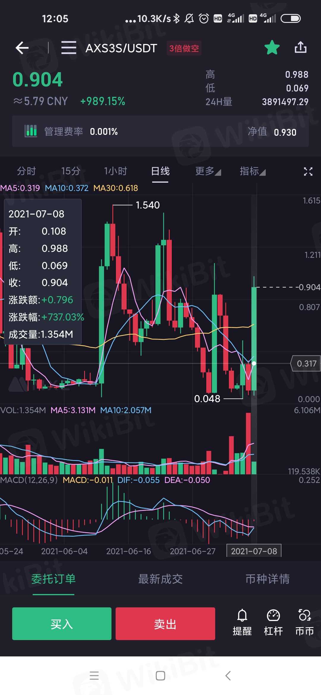 昨天晚上0.16买的涨到0.9说是涨900%今天早上委托量65变6.5,反正我是看不懂,按3倍的我的也没归零